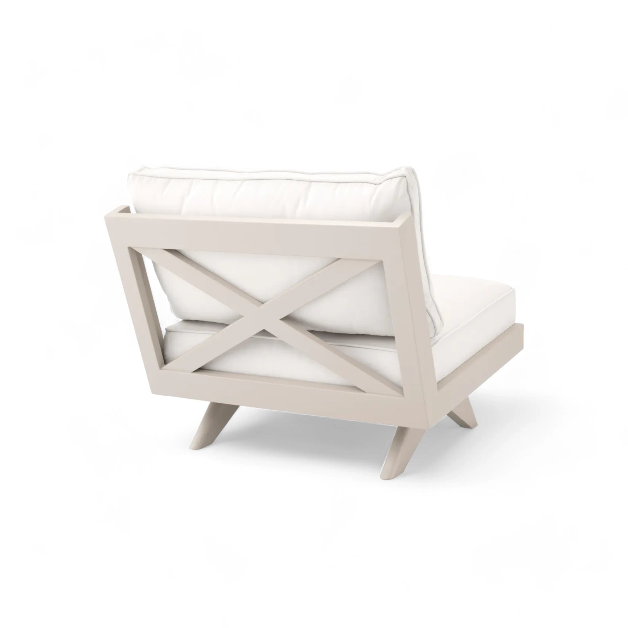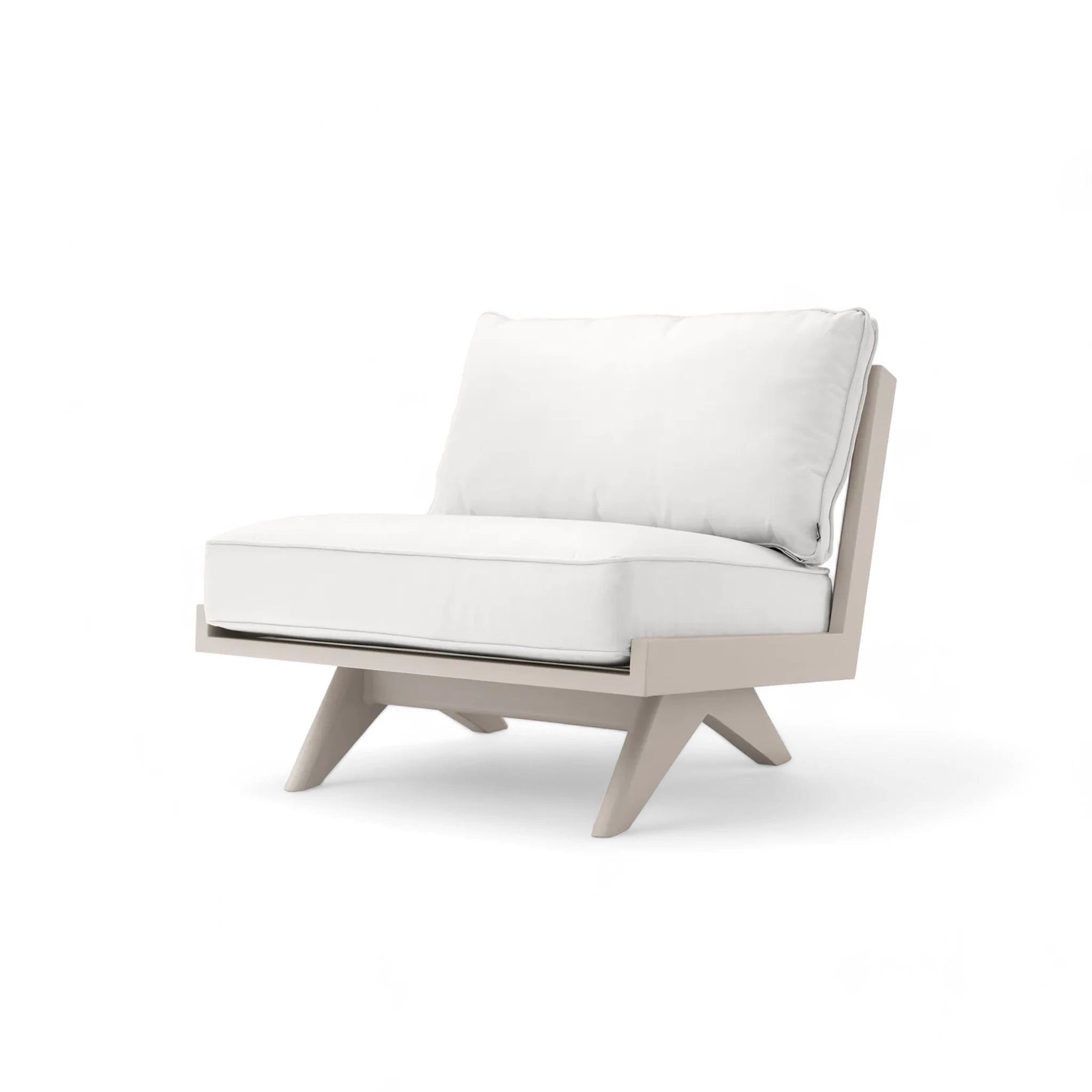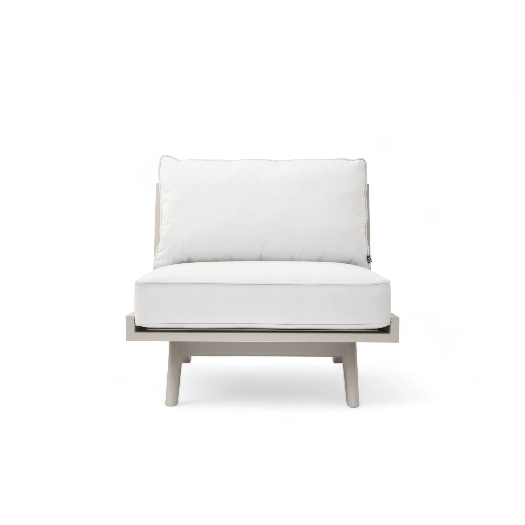 Minimalista ma estremamente confortevole, questa lussuosa sedia da esterno emana una sensazione di leggerezza e relax. Struttura color sabbia, viene fornita con cuscini in tela sunbrella.