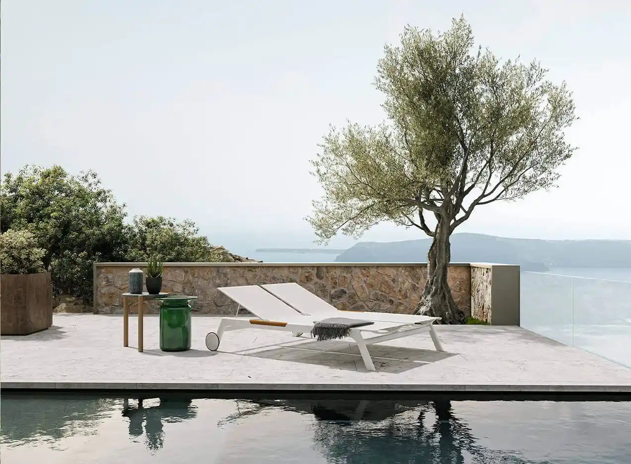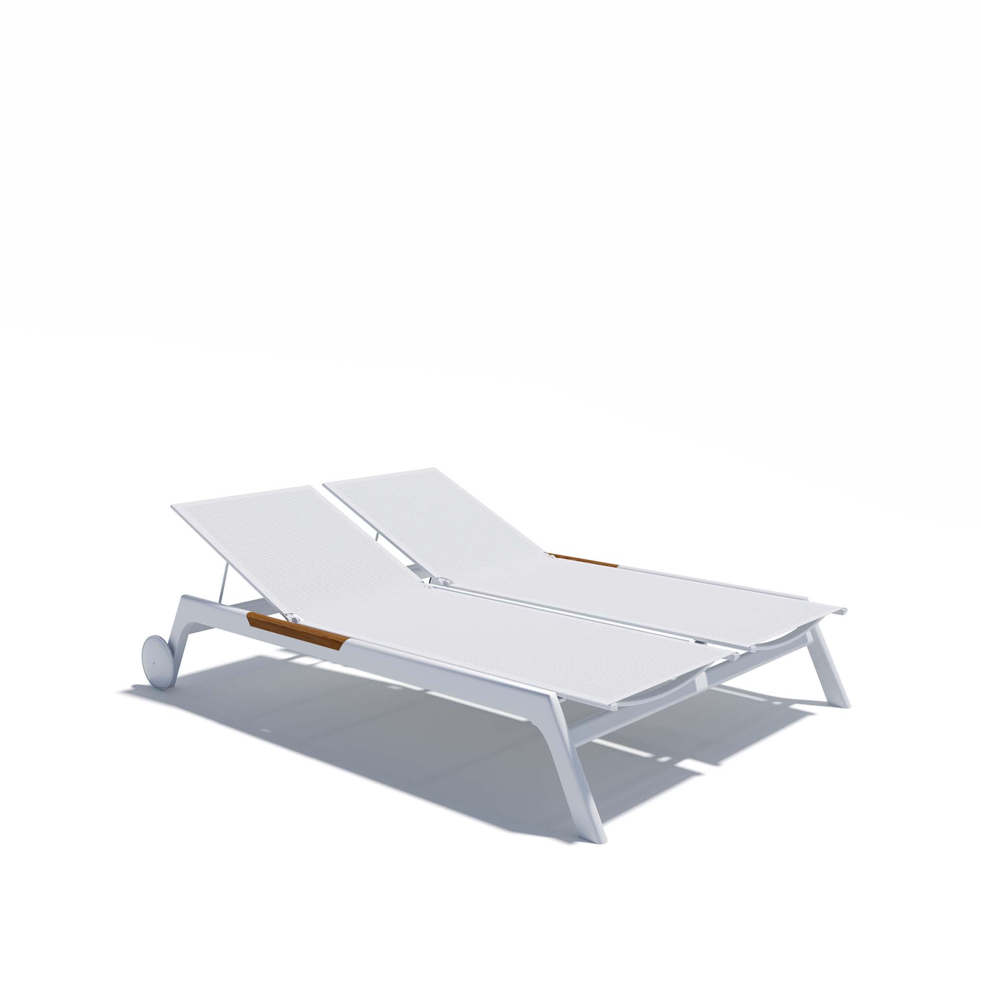 نقية ونظيفة وخالد. يعد Nevada Sunbed عبارة عن كرسي استلقاء للتشمس مصنوع من الجرافيت أو الألومنيوم الأبيض مع إدخالات من خشب الساج، وهو مثالي للمساحات الخارجية ويمكن تكييفه مع أي سياق من السكني إلى الضيافة. وسادة المقعد متضمنة.