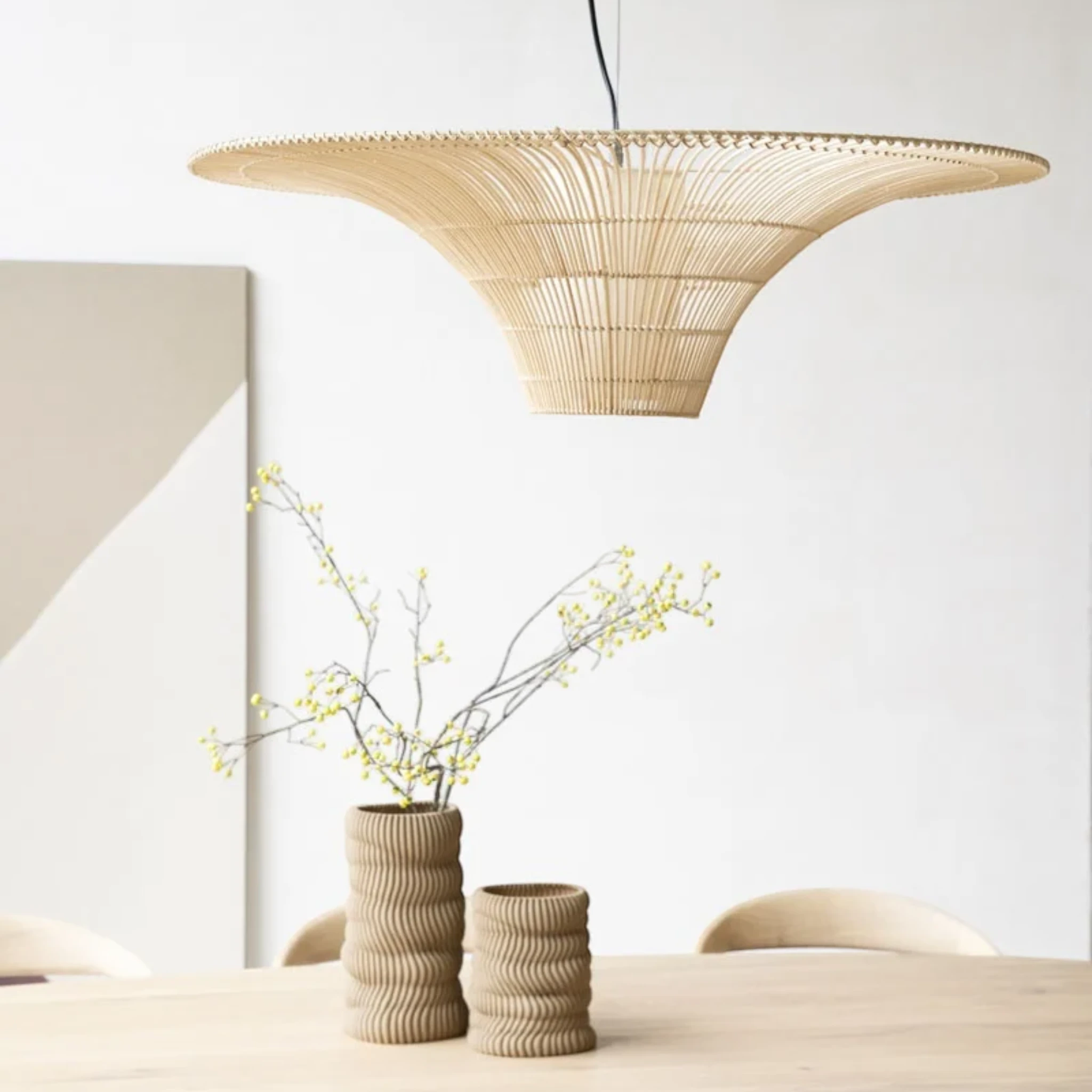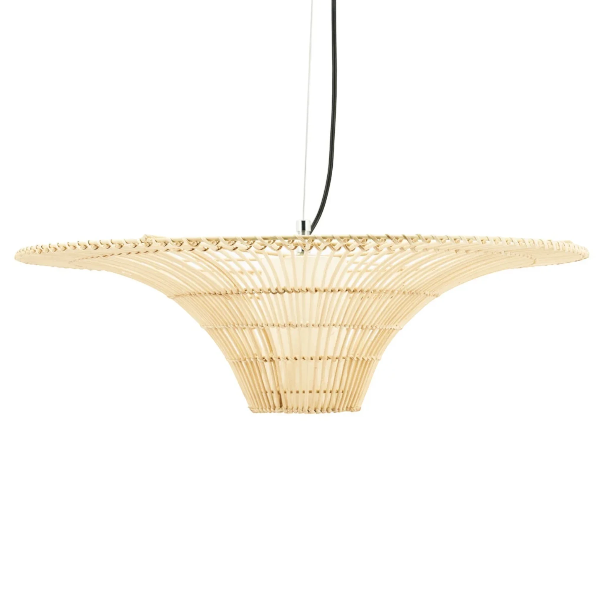 هانوي، مصباح معلق جميل مصنوع من الروطان والمعادن باللون الخشبي الطبيعي. يضيف المصباح عنصرًا دافئًا وطبيعيًا إلى أي بيئة.