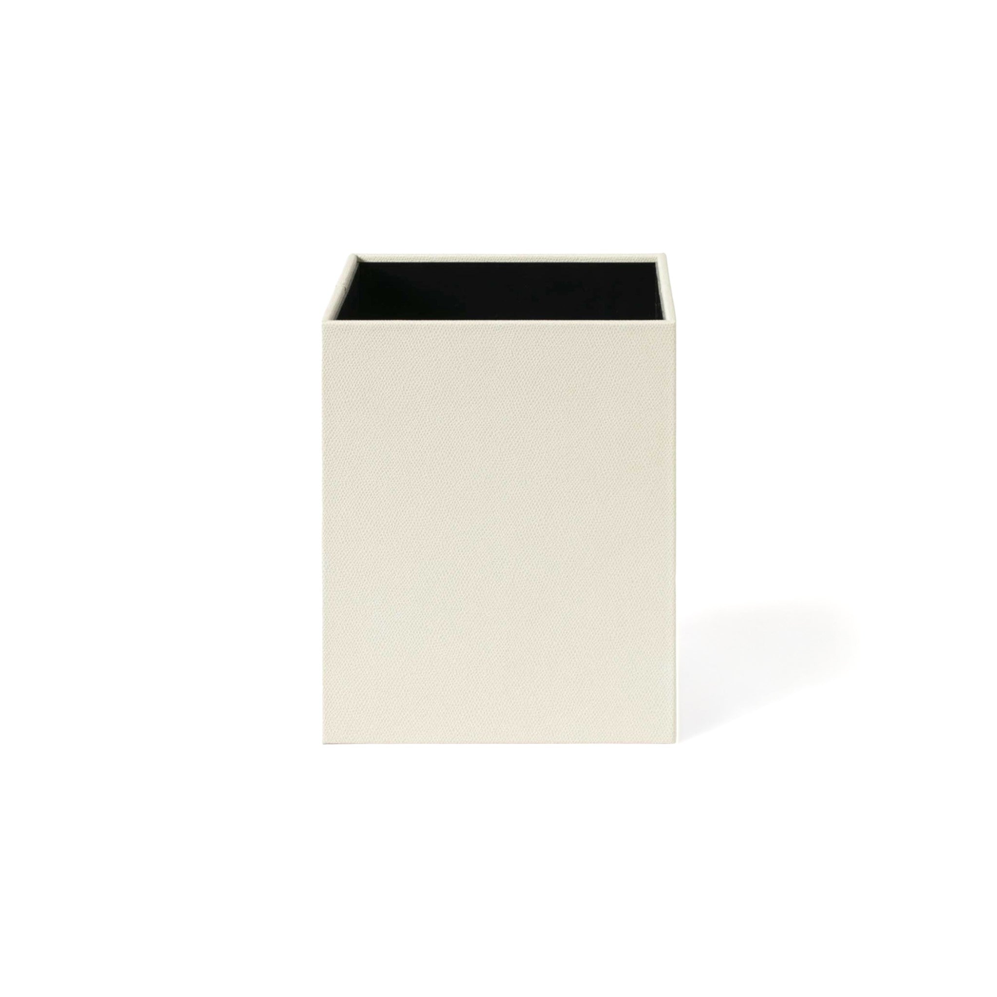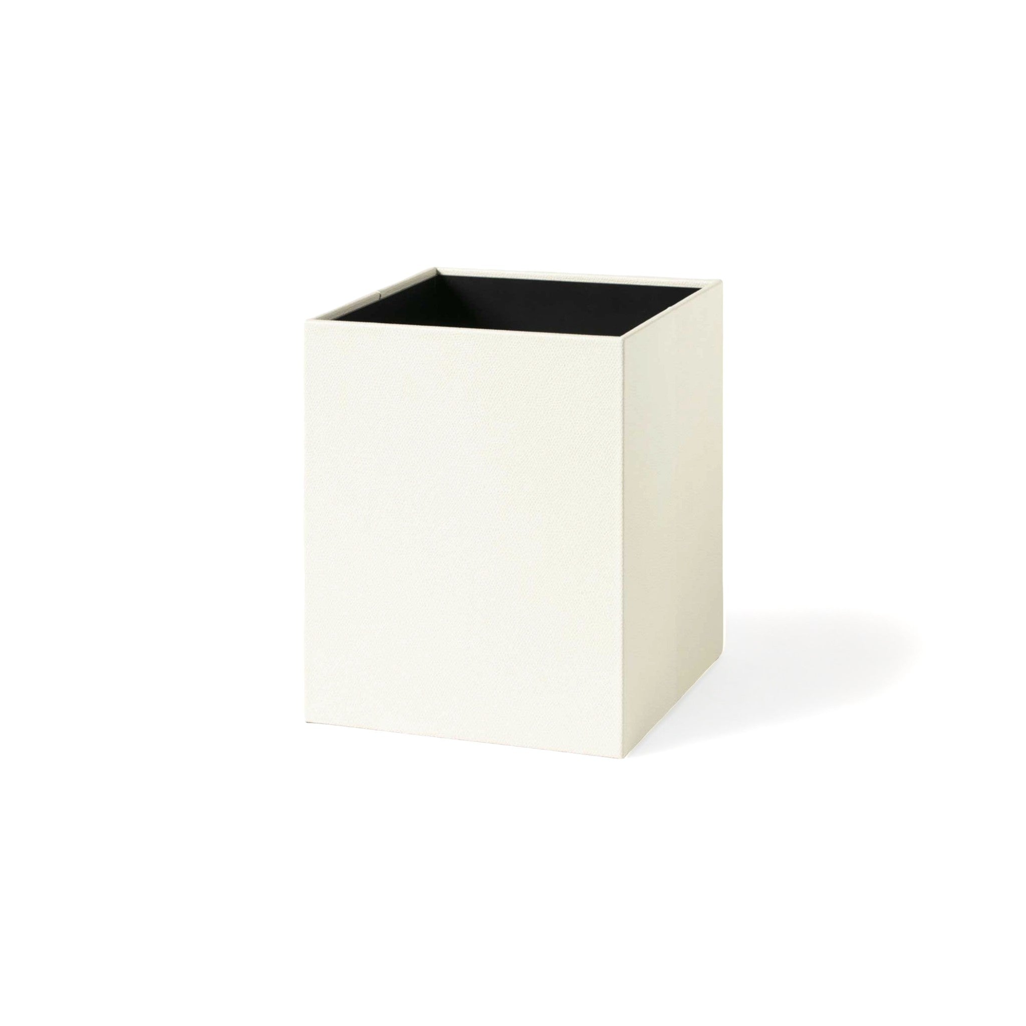 سلة مربعة، مغطاة بالجلد، وقاعدة من مادة مضادة للانزلاق. مثالية كسلة مهملات بخط نظيف وأنيق.