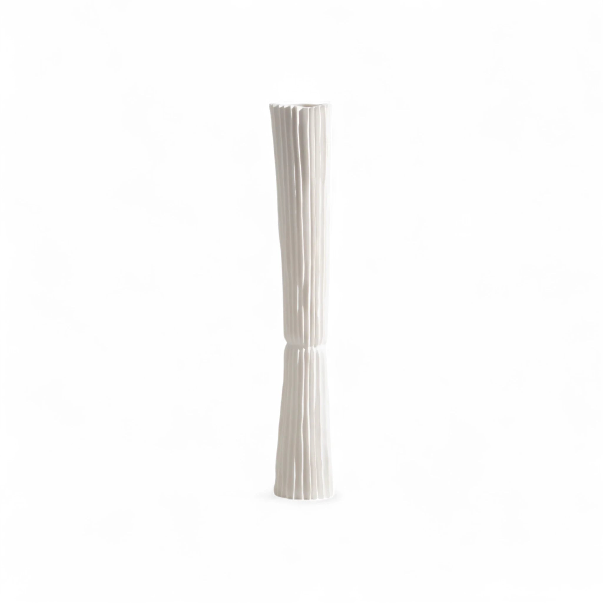 تضيع العين بين آلاف الأخاديد في سلسلة من المستويات، تلاحق البنية الصفائحية الكثيفة. مزهريات خزفية بيضاء، تشبه أعمدة أنيقة، تُجسّد جمالًا كلاسيكيًا بتصميم معاصر.