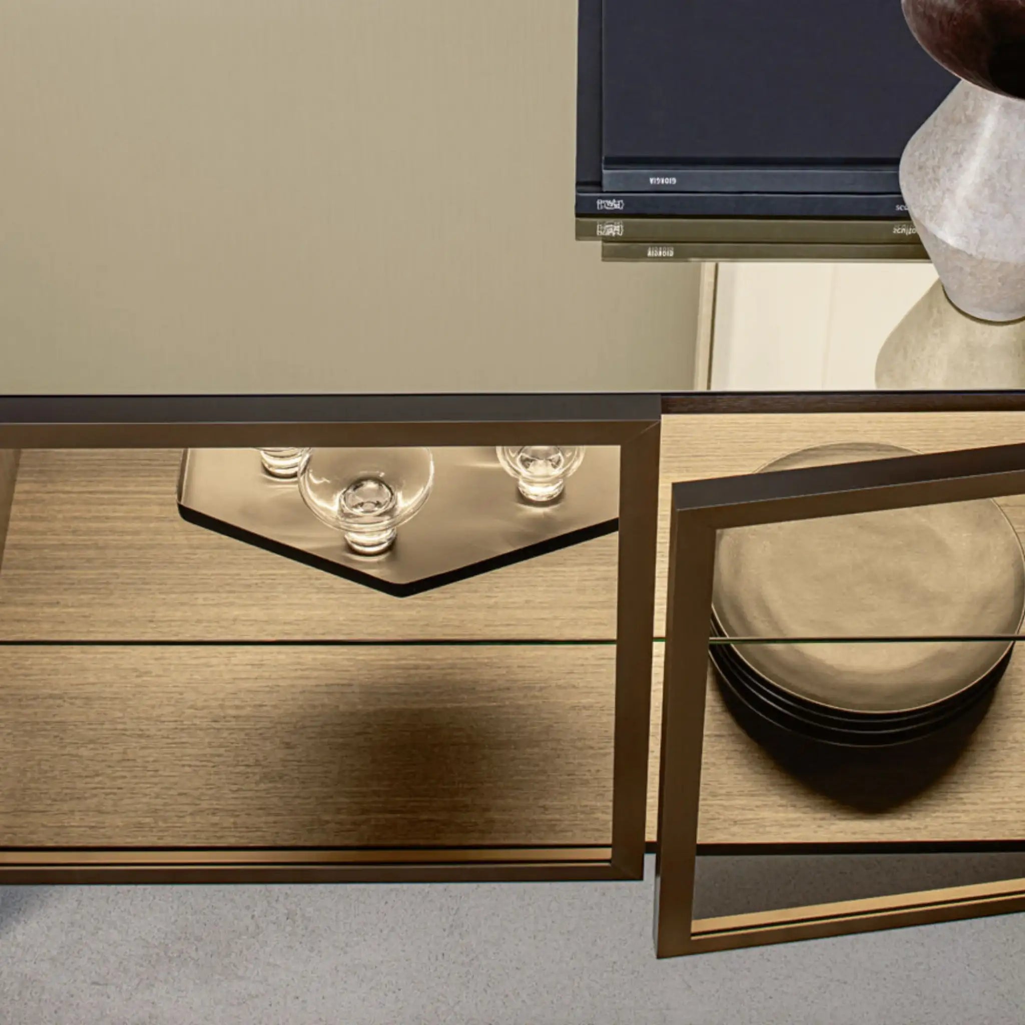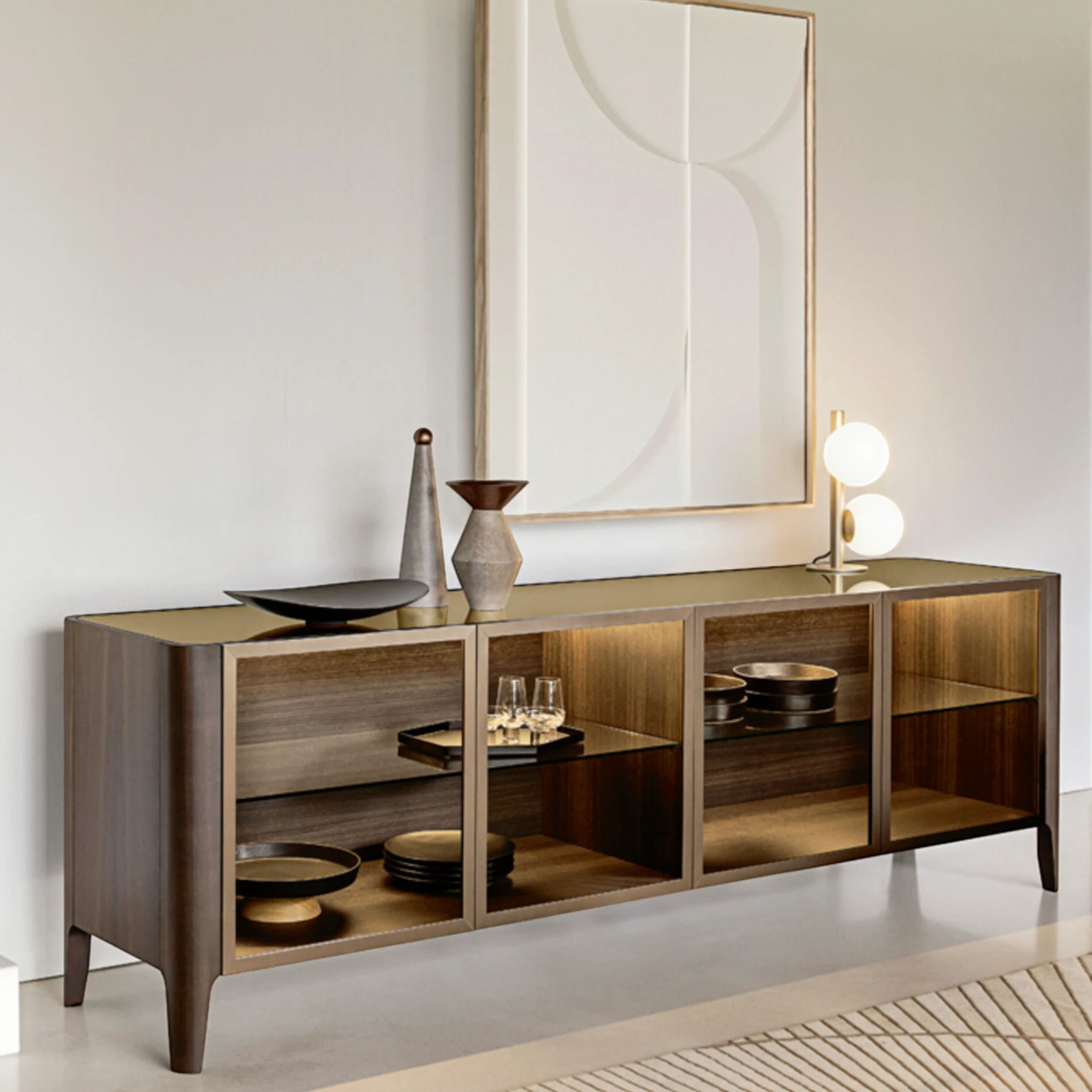 خزانة جانبية كروسا بأربعة أبواب مع أبواب مفصلية ورفوف زجاجية داخلية. الجزء العلوي مصنوع من السيراميك البندق اللامع، مع إضاءة داخلية مع جهاز تحكم عن بعد.