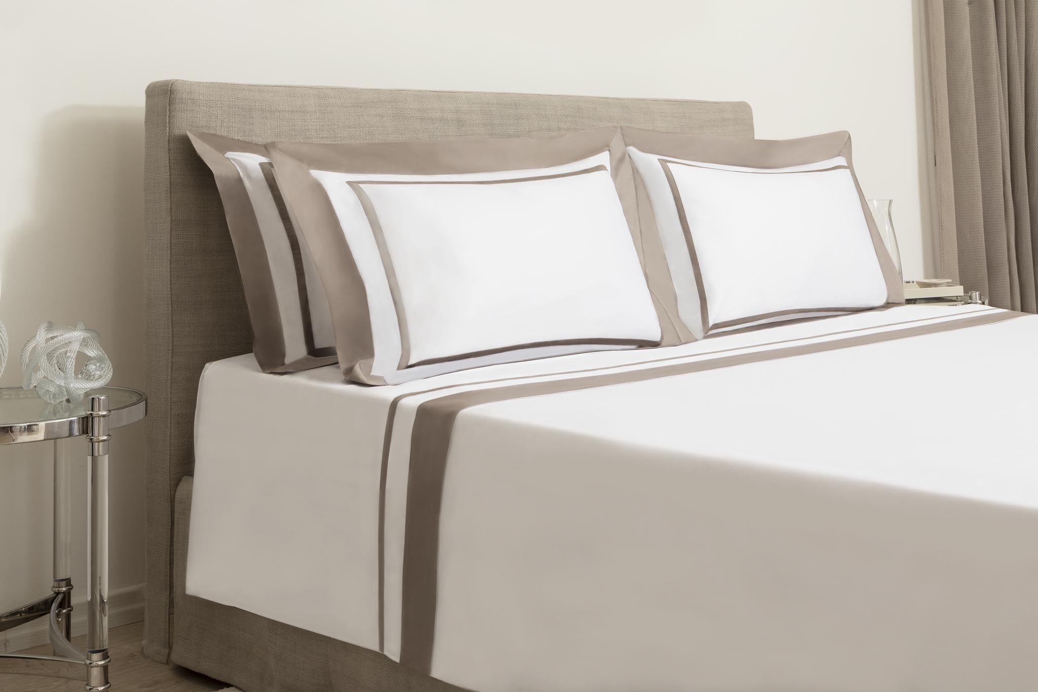 Completo letto in soffice cotone italiano satinato TC 300 rifinito con bordo a contrasto double. Tagliato a mano e confezionato artigianalmente in Italia.
