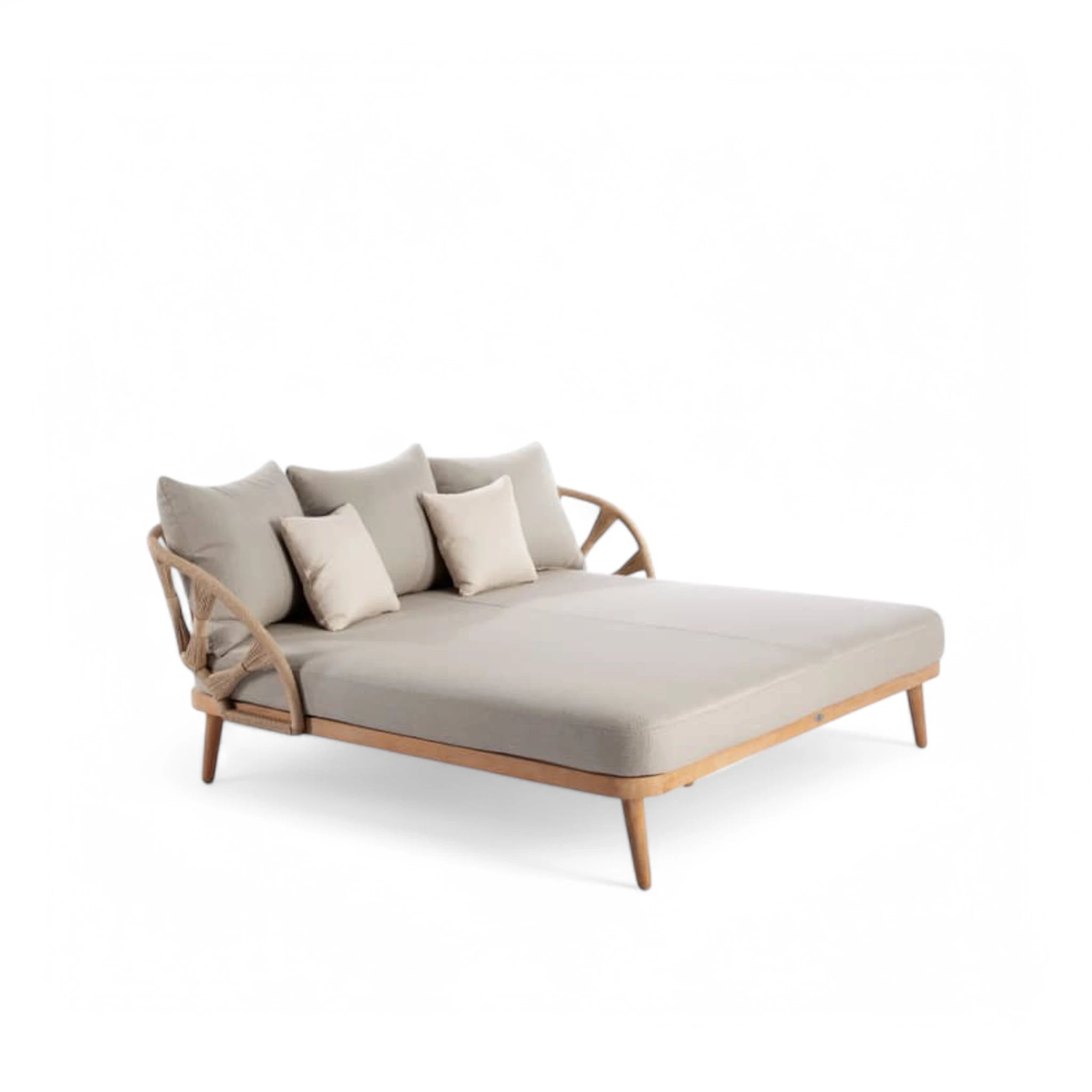 Crea una serena oasi all'aperto con l'elegante Daybed Venere. Realizzato con struttura in legno di teak naturale ed intreccio in corda naturale che richiamano i toni della terra, offre un spazio invitante per rilassarsi. Il daybed è completo di cuscini sfoderabili: un cuscino seduta e 3 cuscini schienale.