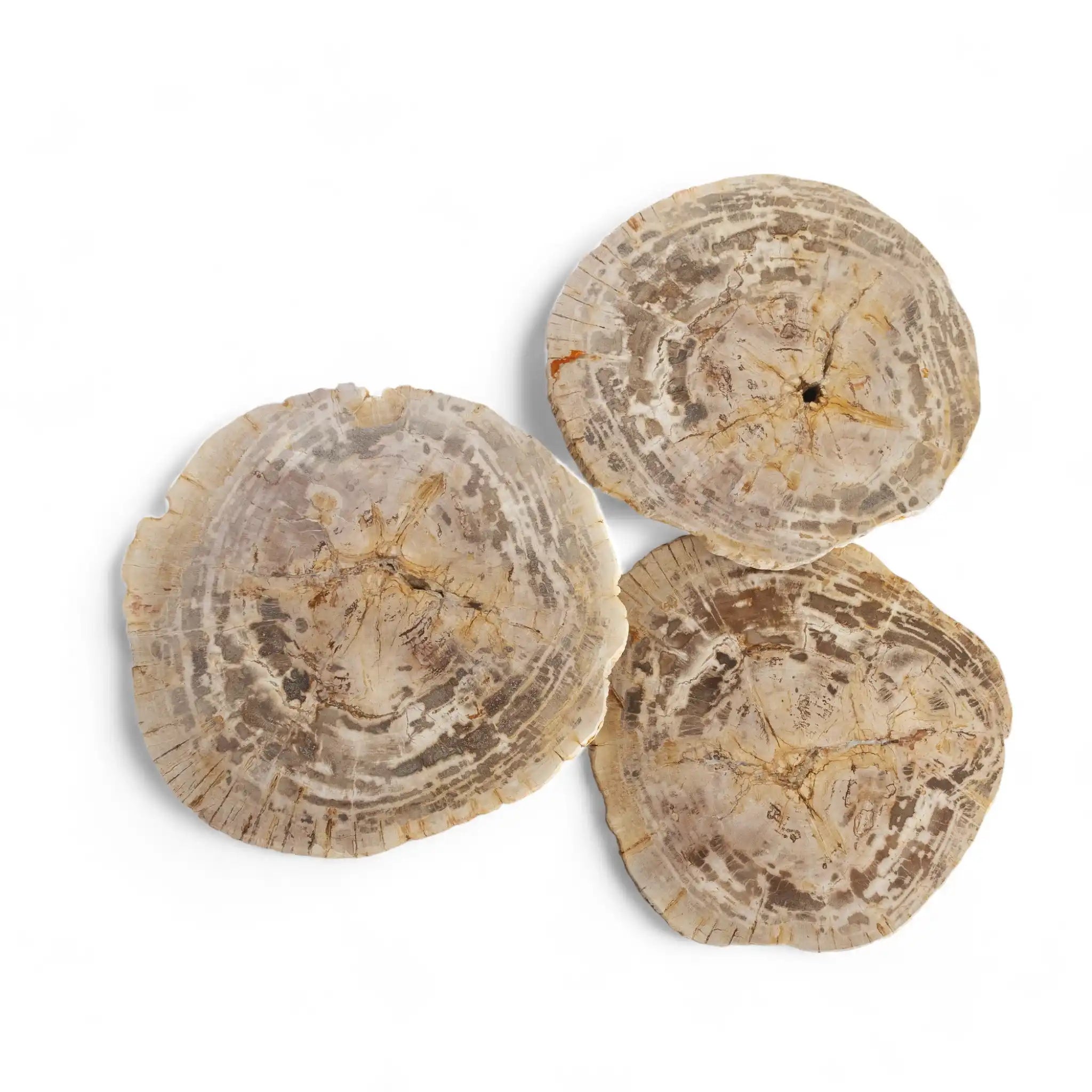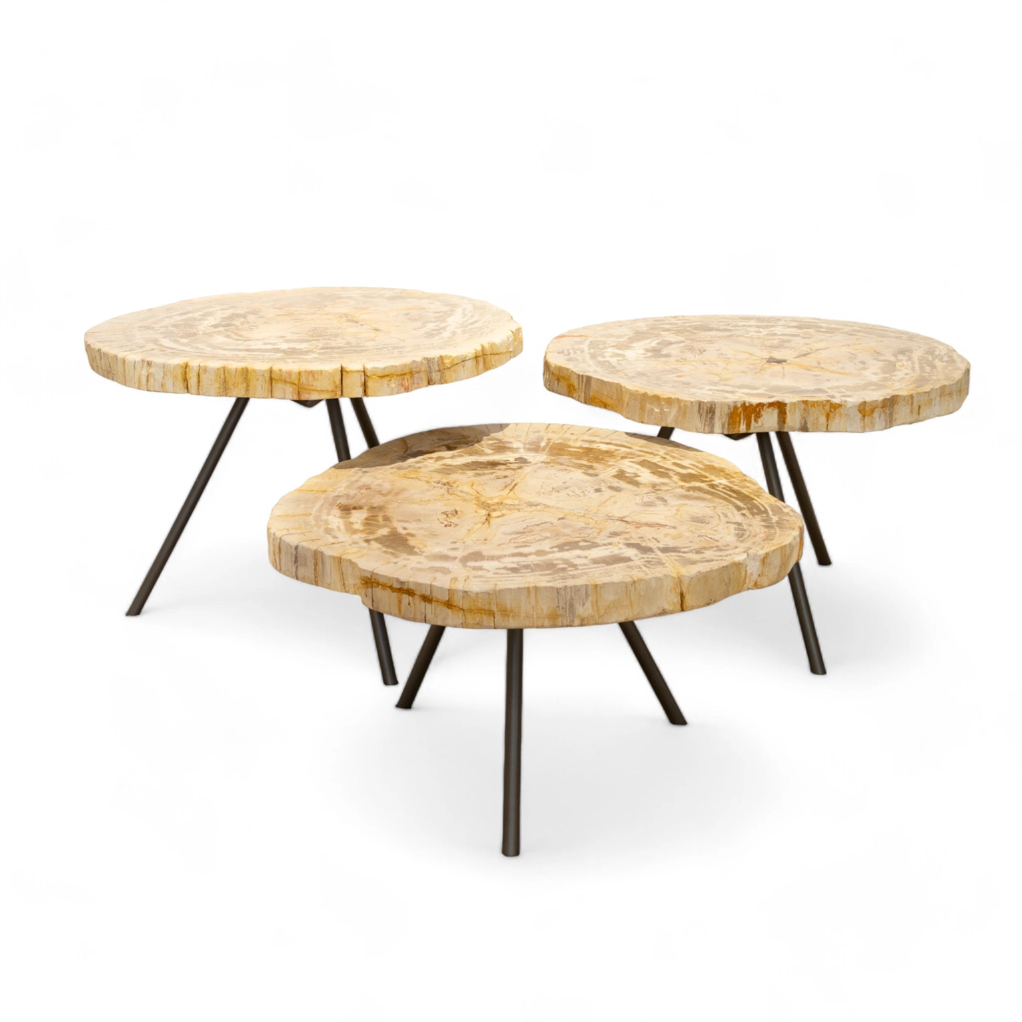 Il set di 3 tavolini da caffè Soto incarna un'atmosfera fresca miscelata con un tocco di moderno dei primi anni '50. I tavolini circolari sono realizzati a mano in legno pietrificato, garantendo a ciascun pezzo un'unicità completa, con colori e forme differenti.