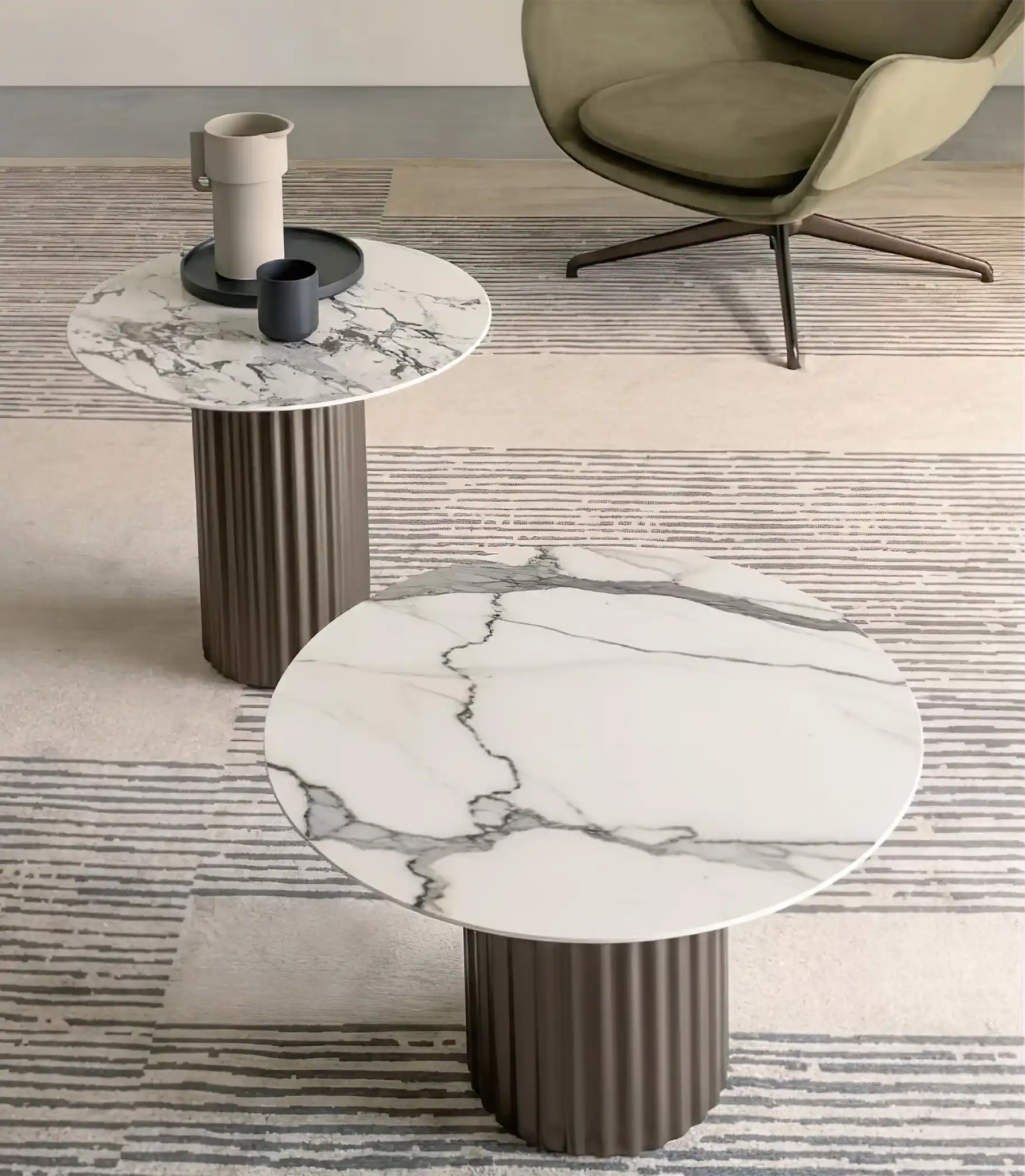 Elegante, sofisticato e imponente: il tavolino da salotto Enea non passa inosservato. Pur nelle dimensioni compatte, conserva il carattere e la forza visiva del tavolo Enea, con una base centrale in metallo con effetto cannettato e piano in ceramica che cattura subito l'attenzione. Le scanalature profonde e precise creano un gioco di luci e ombre, conferendo al tavolino una presenza dinamica e al contempo solida, capace di impreziosire ogni angolo della stanza.