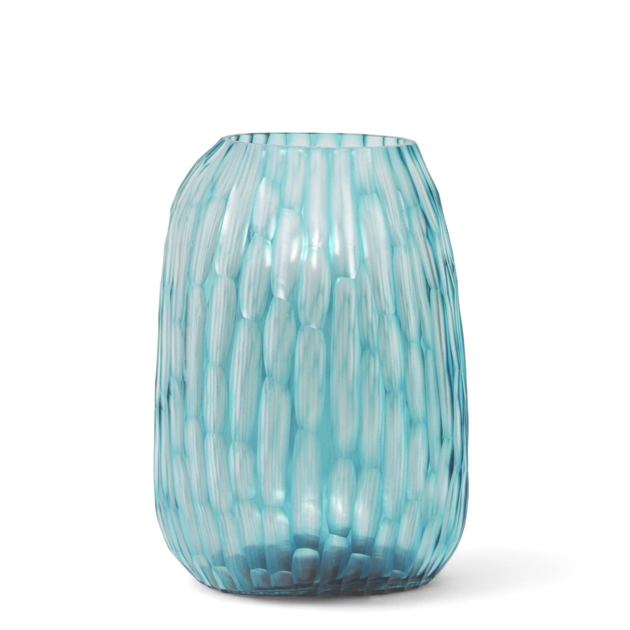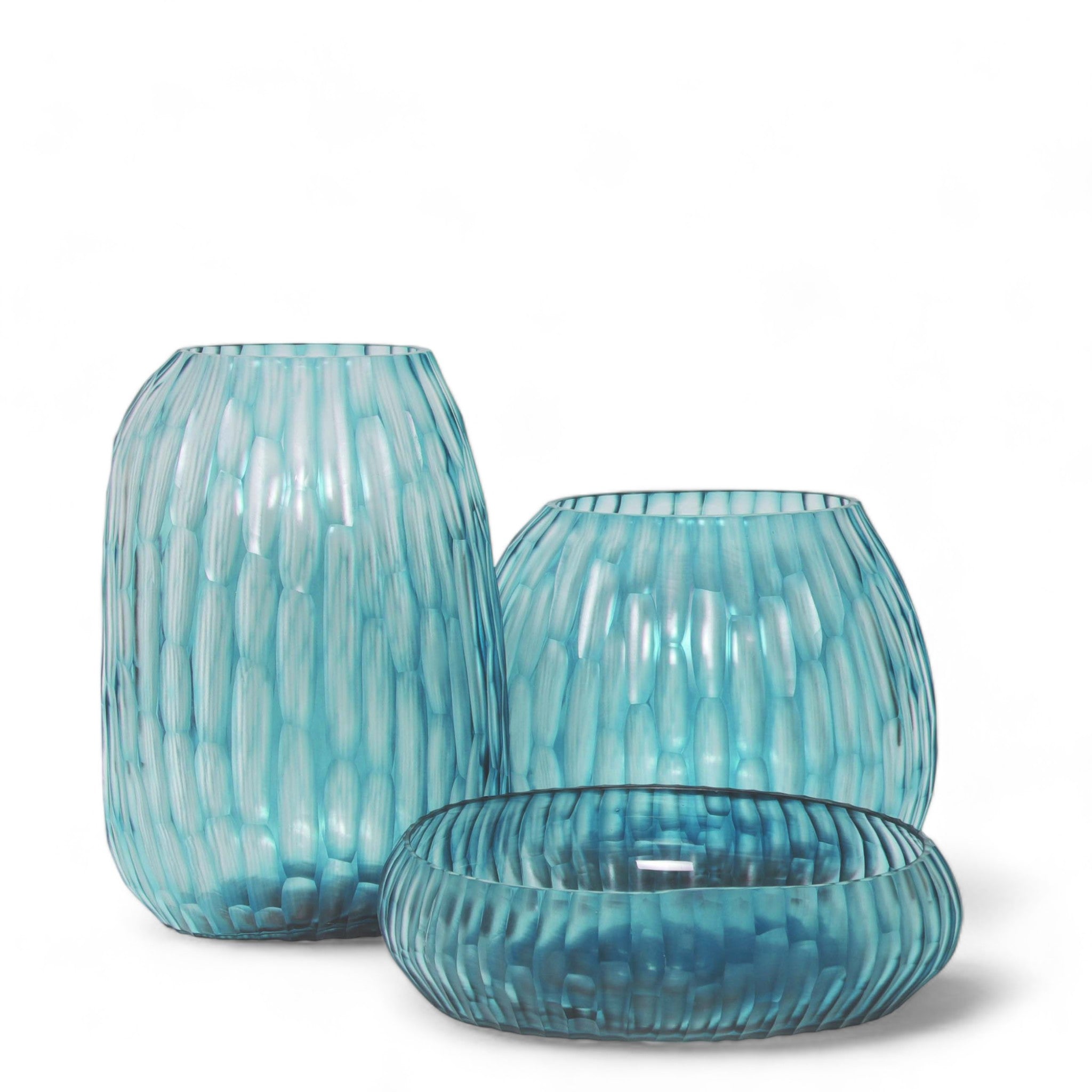 Vaso Clemente di Guaxs, in vetro soffiato turchese con sfumature color petrolio. Un pezzo unico realizzato a mano dal design ricercato ed elegante.