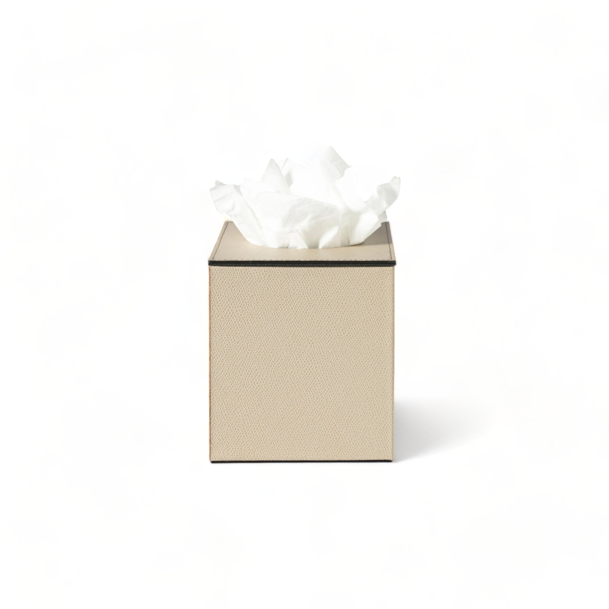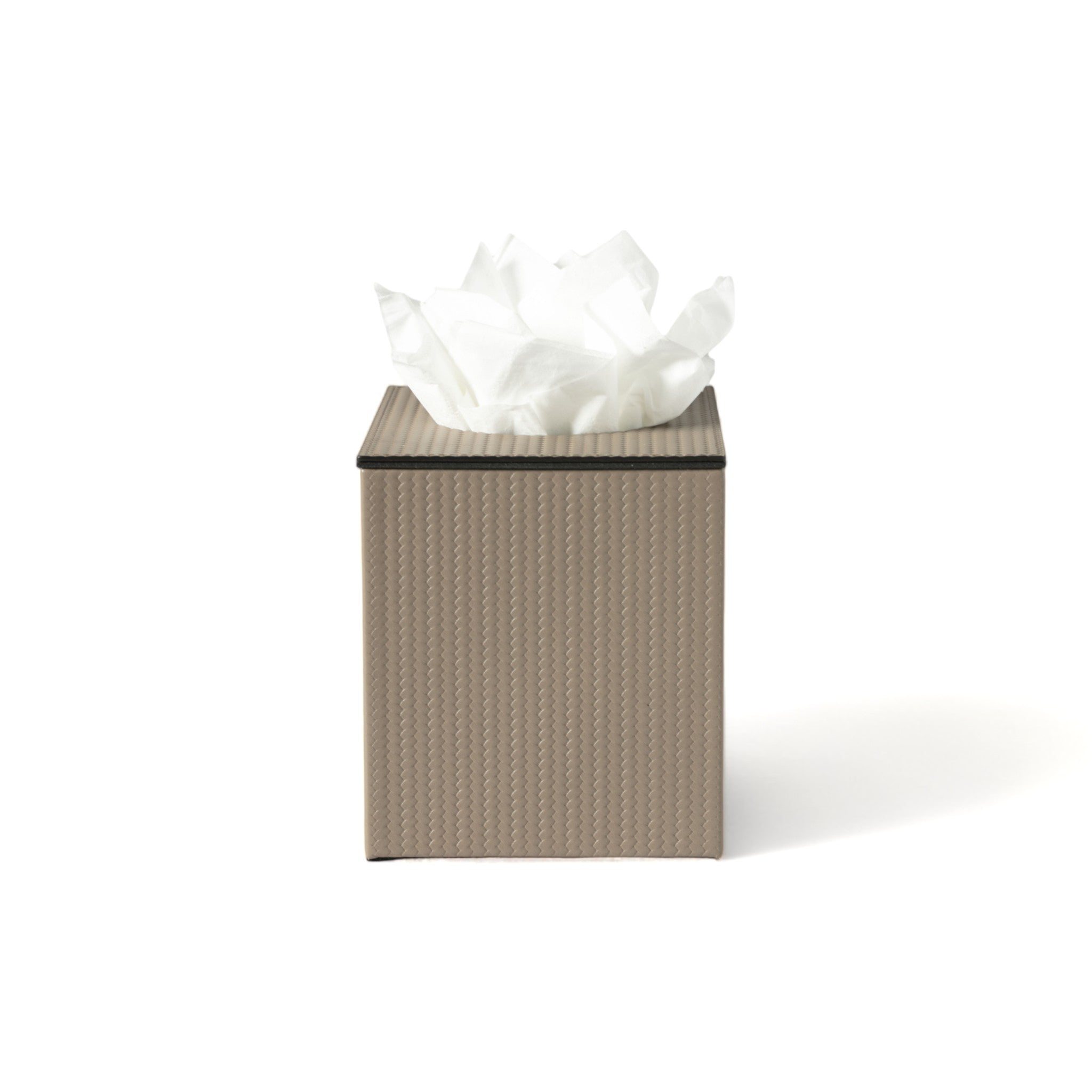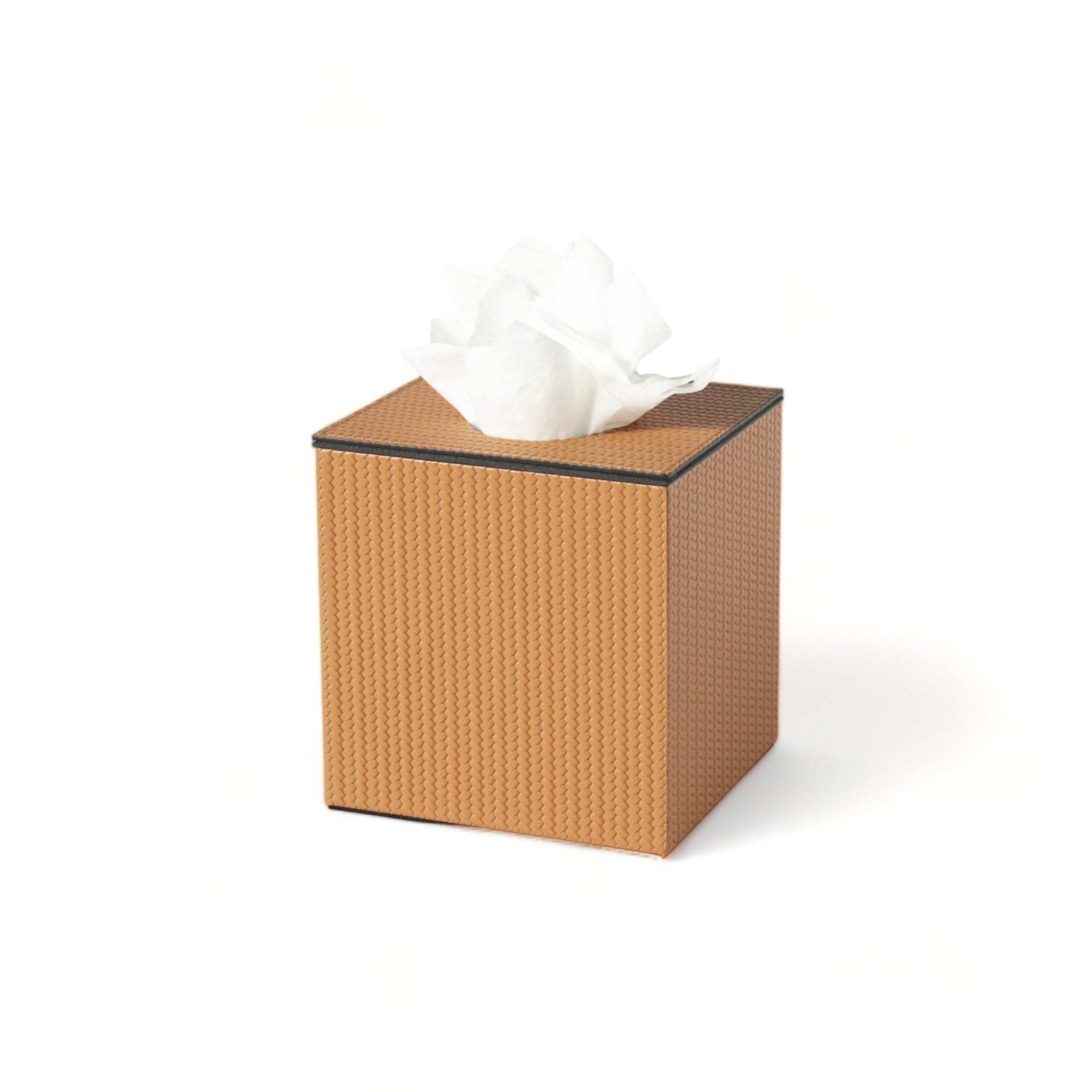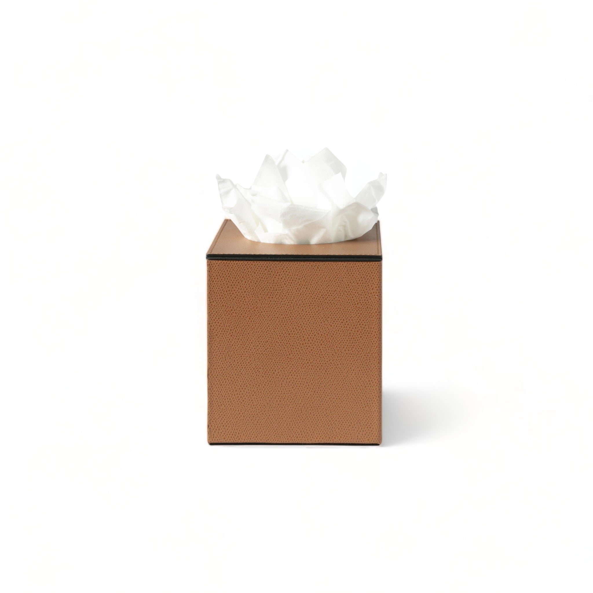 Porta fazzoletti in legno rivestito in pelle, con coperchio a chiusura magnetica.