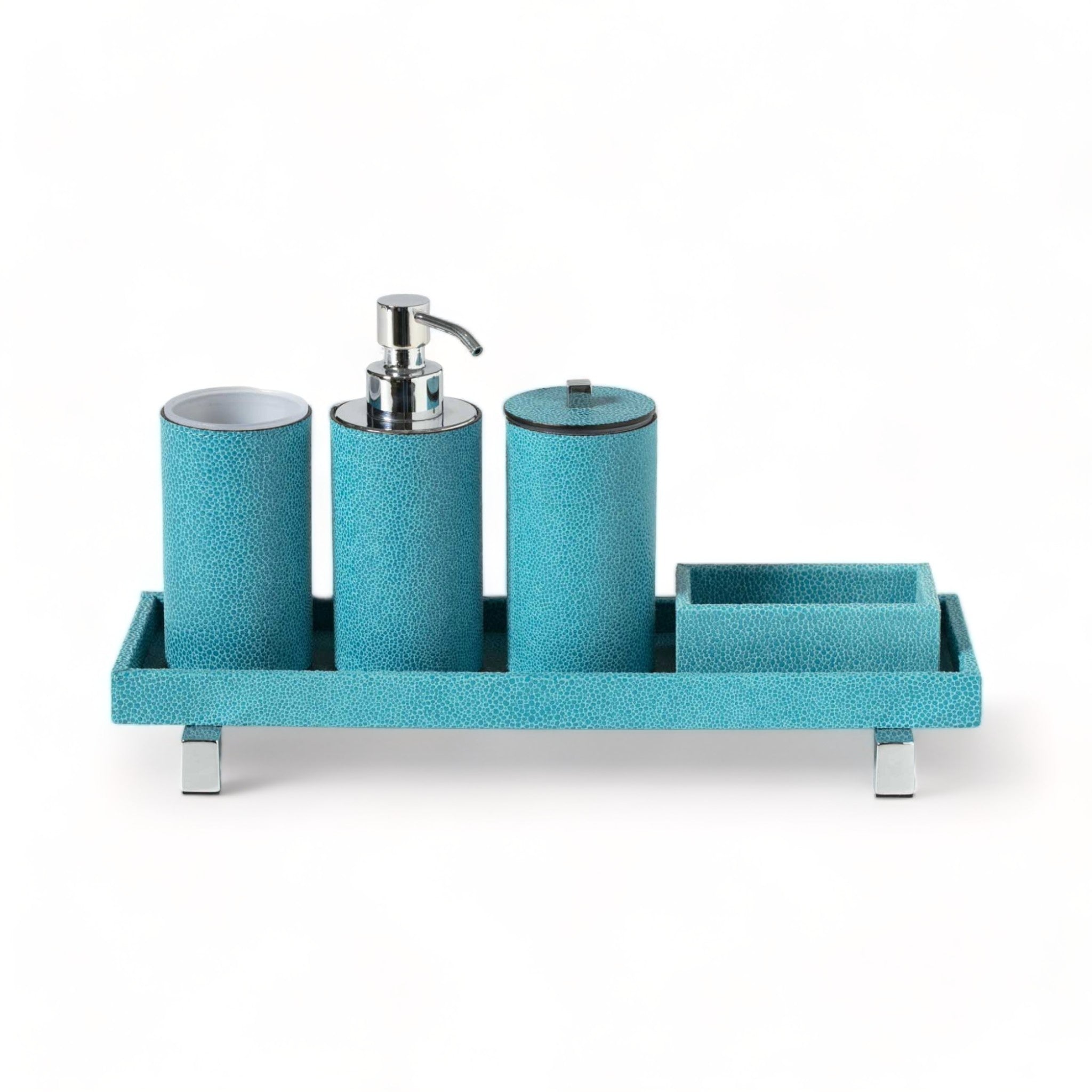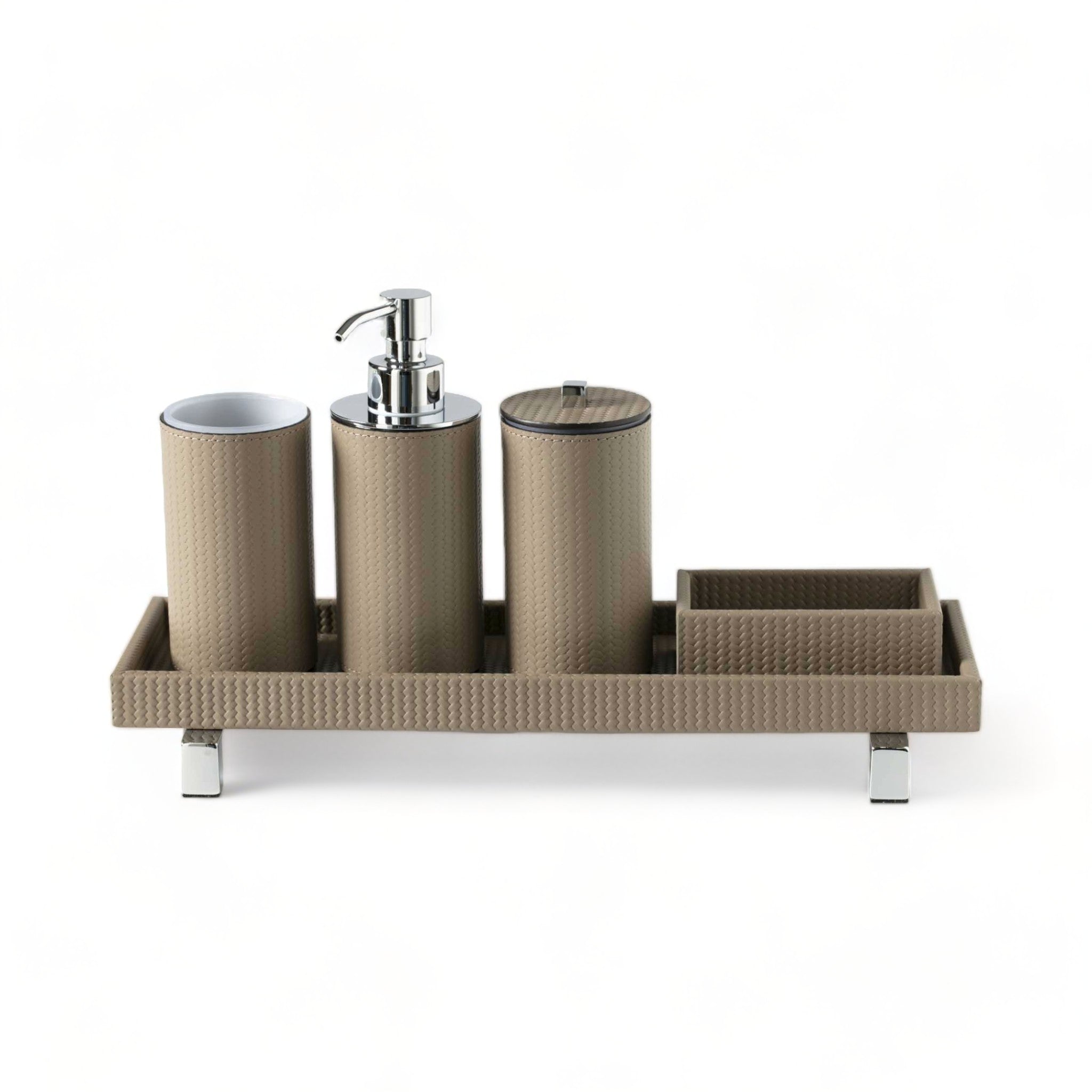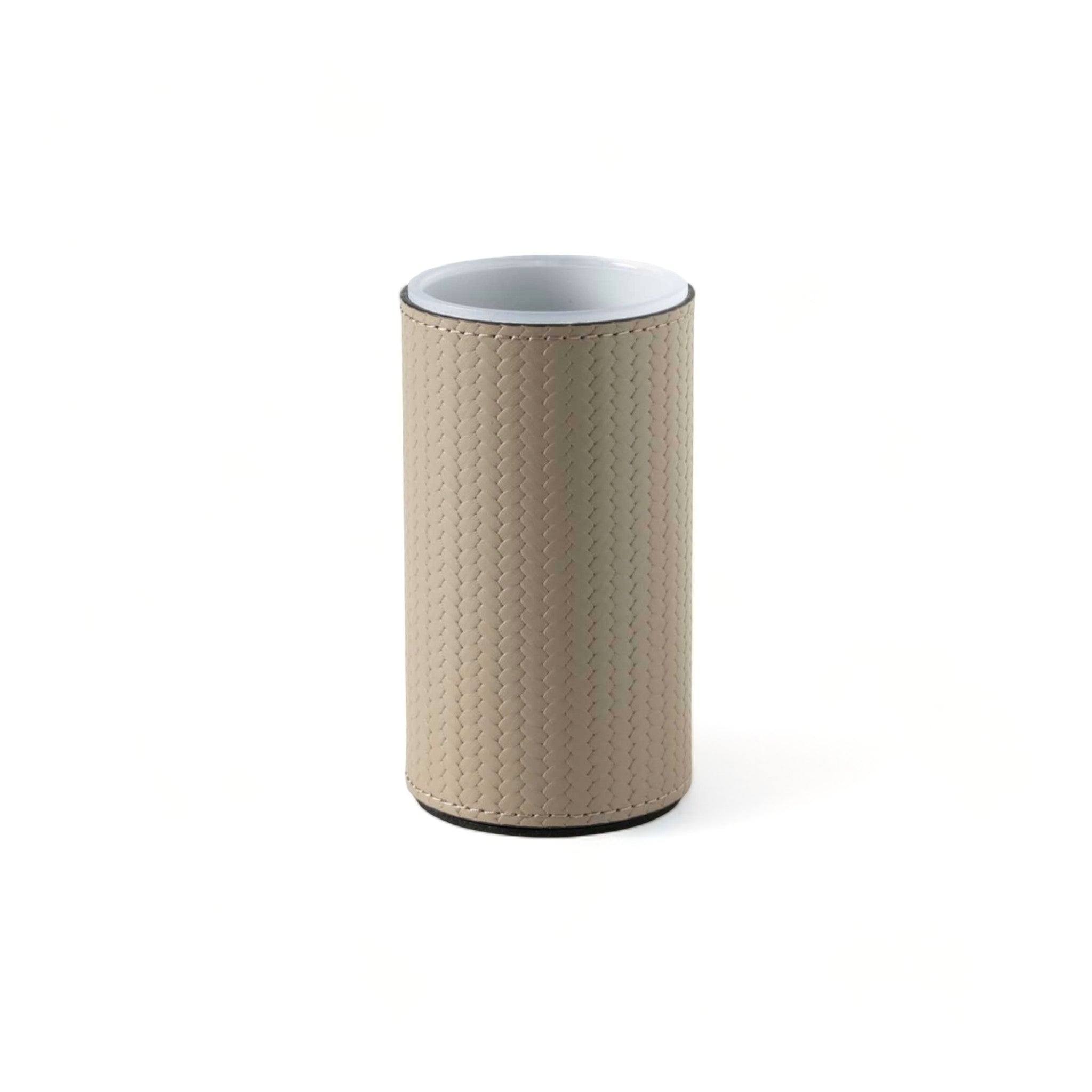 Round toothbrush holder covered in leather.