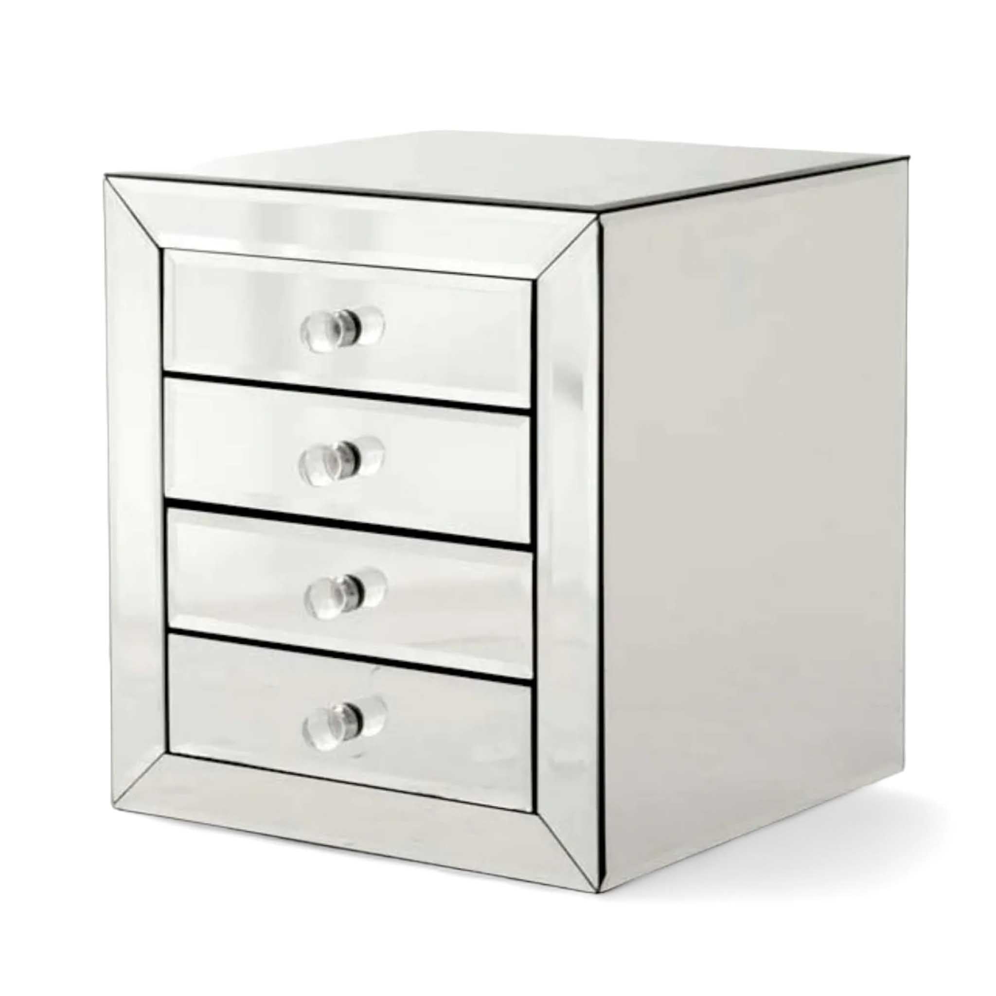 The Reagan bedside table is made of transparent mirrored glass and features a rectangular structure with straight line details and four storage drawers.