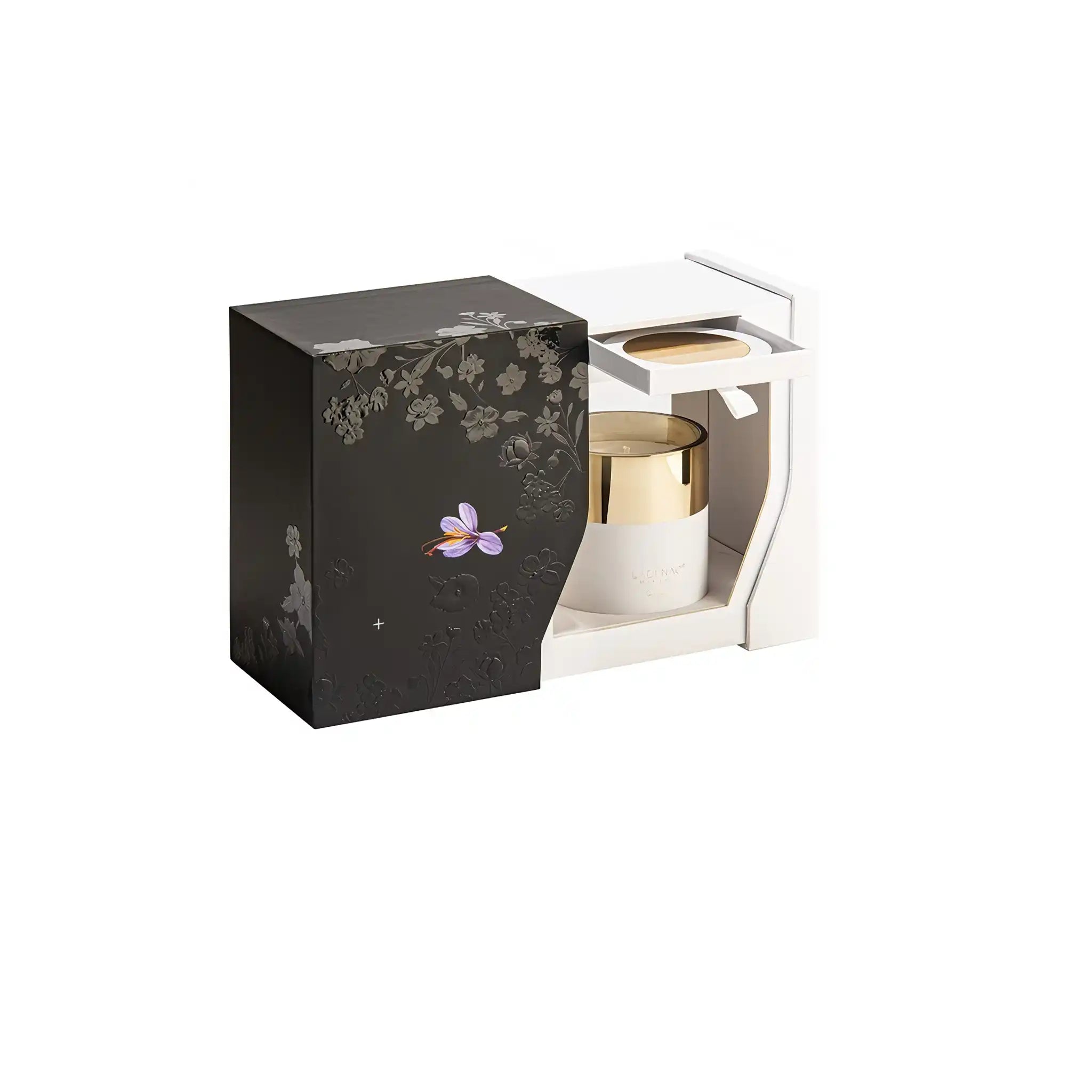Detail – A luxurious scented candle housed in a white-gold designer vase, housed in an elegant box that highlights its sophistication. Its fragrance revolves around saffron. Detail is a decorative object that transforms the atmosphere with sophisticated and vibrant refinement.