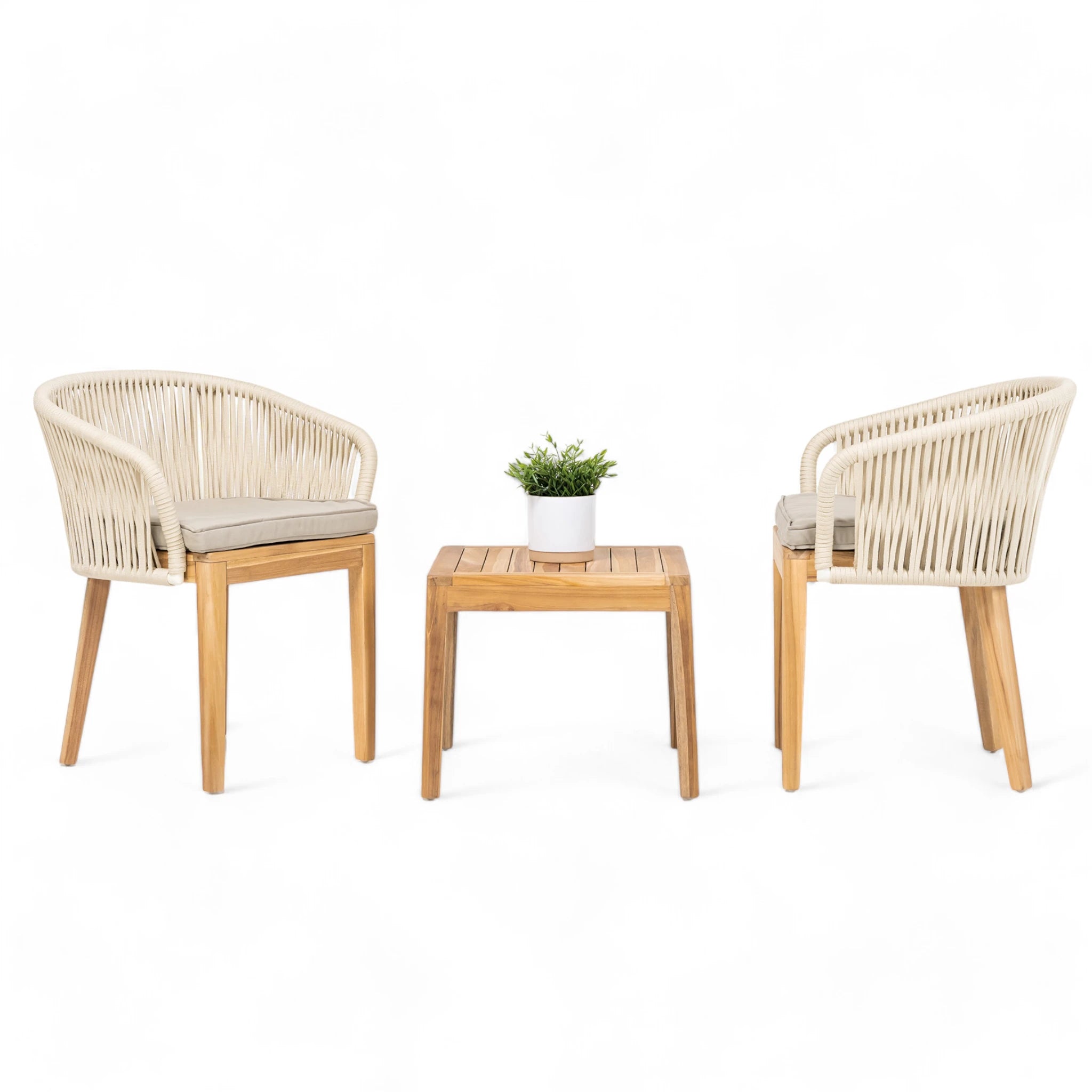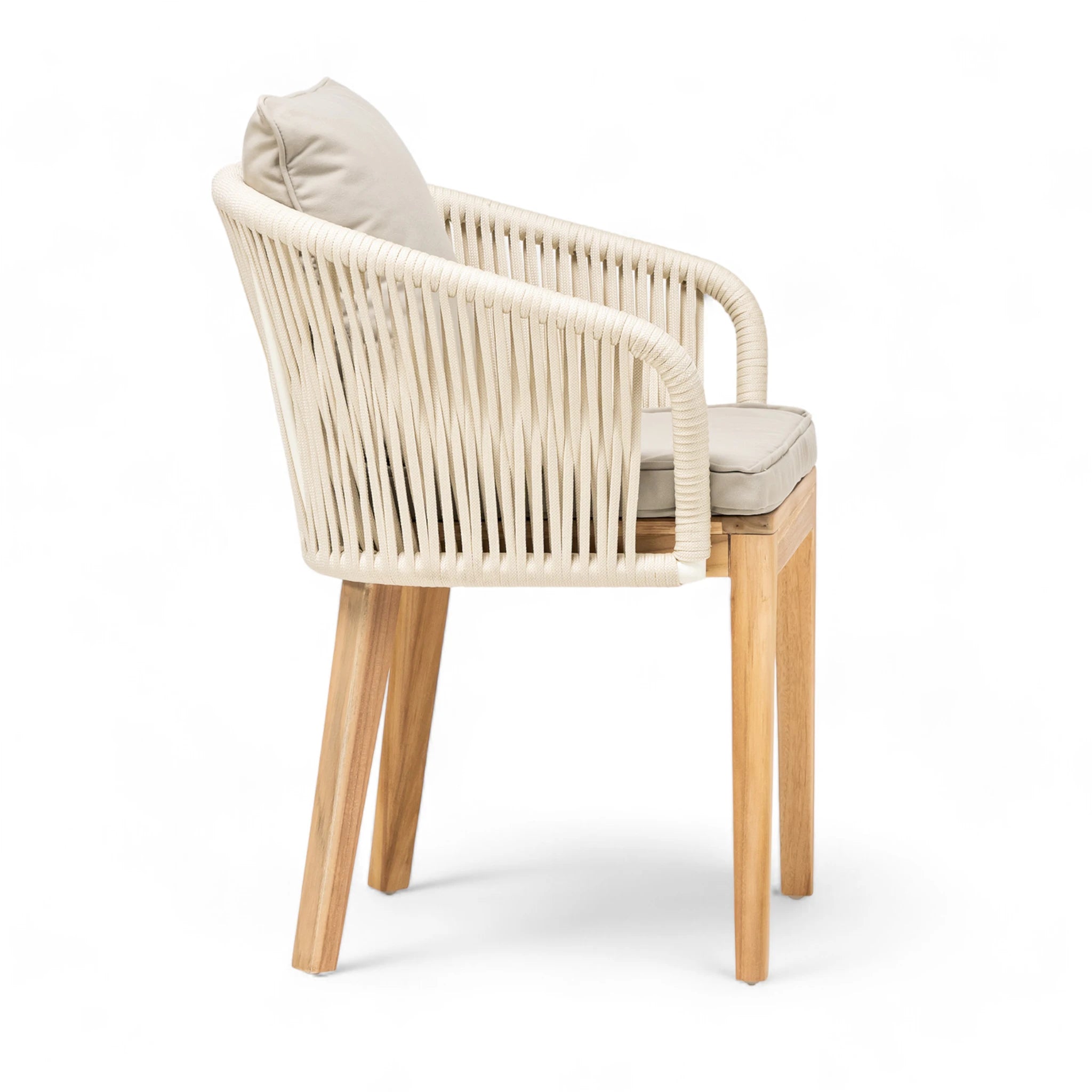The solid teak dining chair with Olefin/Polypropylene rope weave is a perfect mix of elegance and resistance. Ideal for indoors and outdoors, its refined line and the quality of the materials make it a perfect choice for furnishing with style. The seat cushion is included.