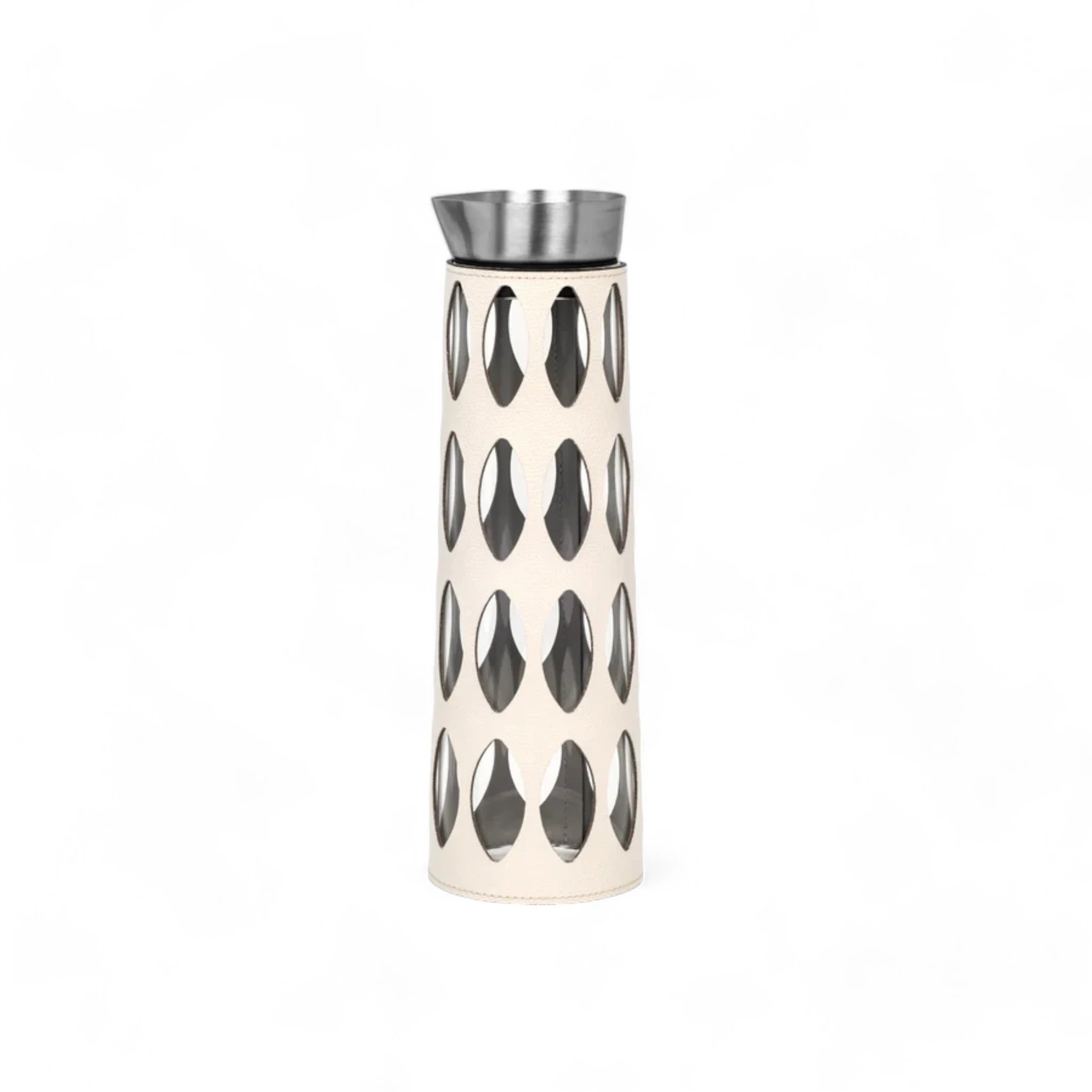 Glass carafe with removable leather cover. Satin stainless steel cap.