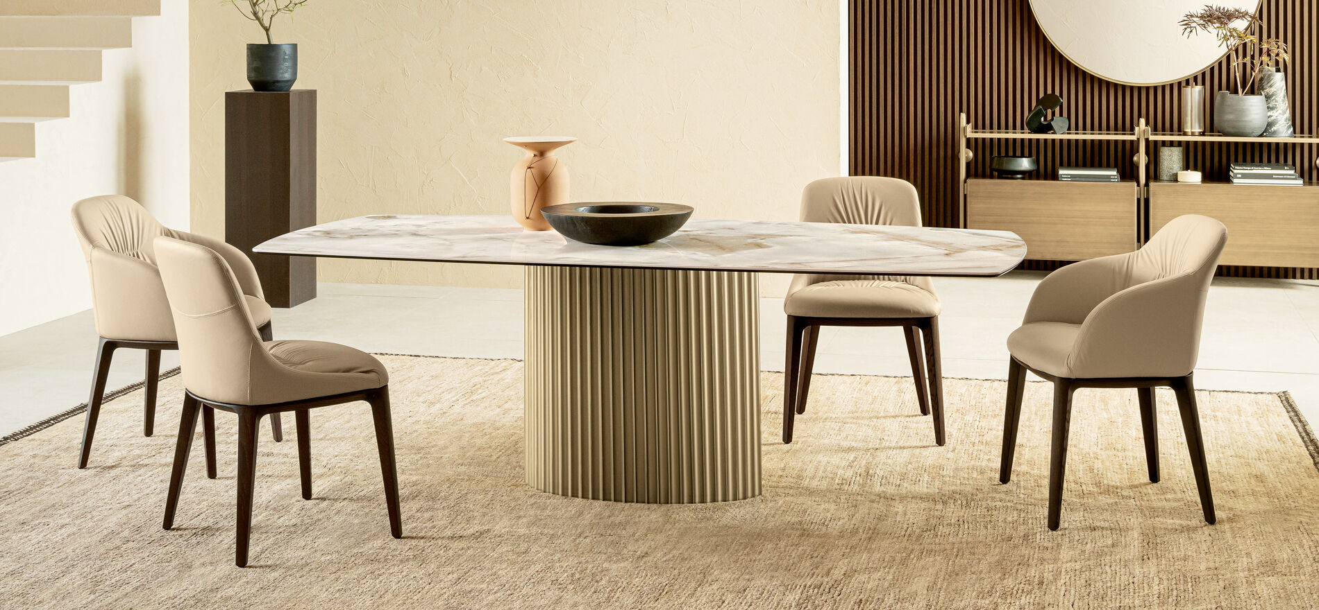 The Enea table is a true celebration of design, where materials and shapes meet in perfect harmony. Available in variants that include a ceramic or wooden top, it adapts with versatility to different spaces and tastes. Material and scenographic, it is the central column of the base that captures the attention; with its deep and well-defined grooves, it gives a sensation of movement and solidity at the same time, elevating it to the undisputed protagonist of the room.