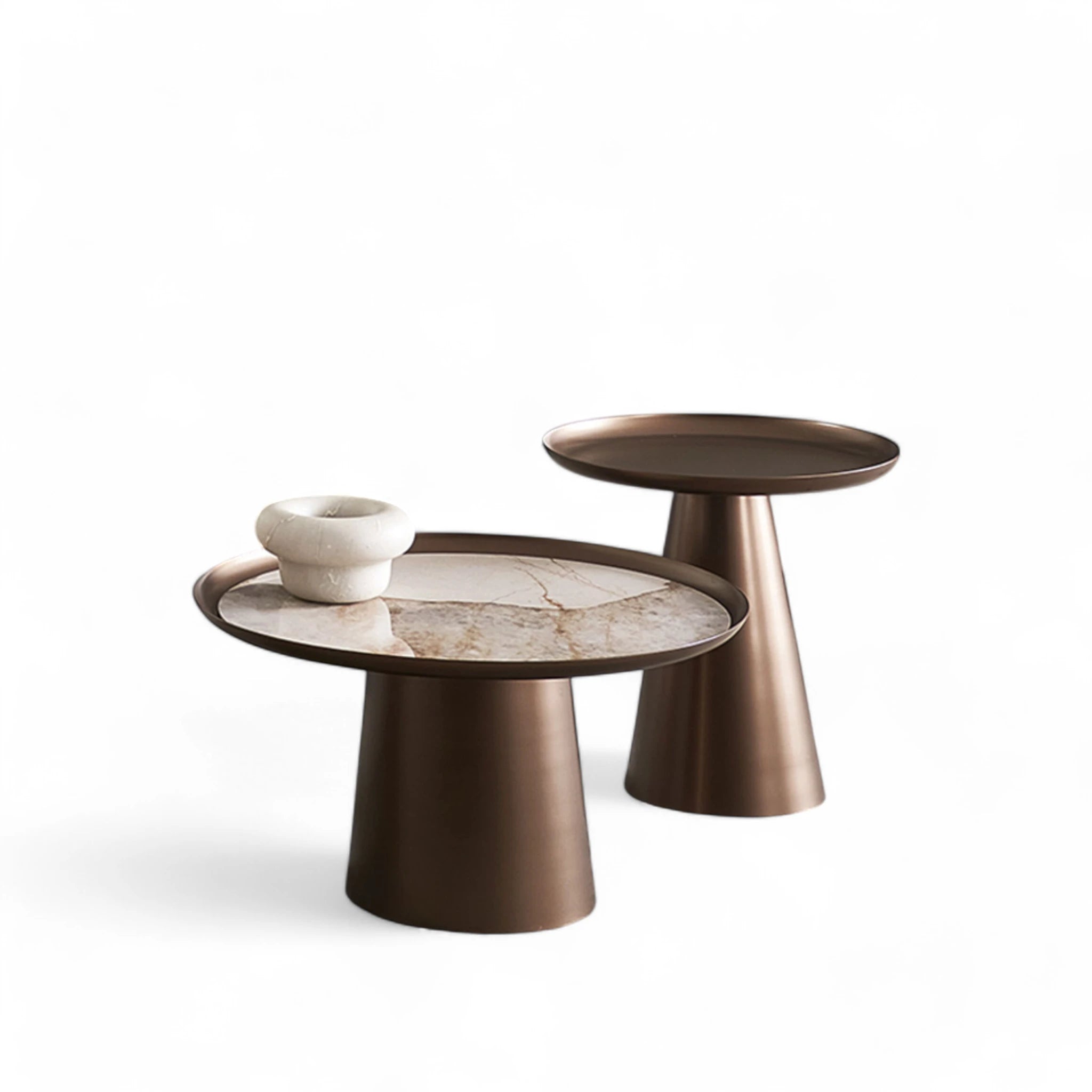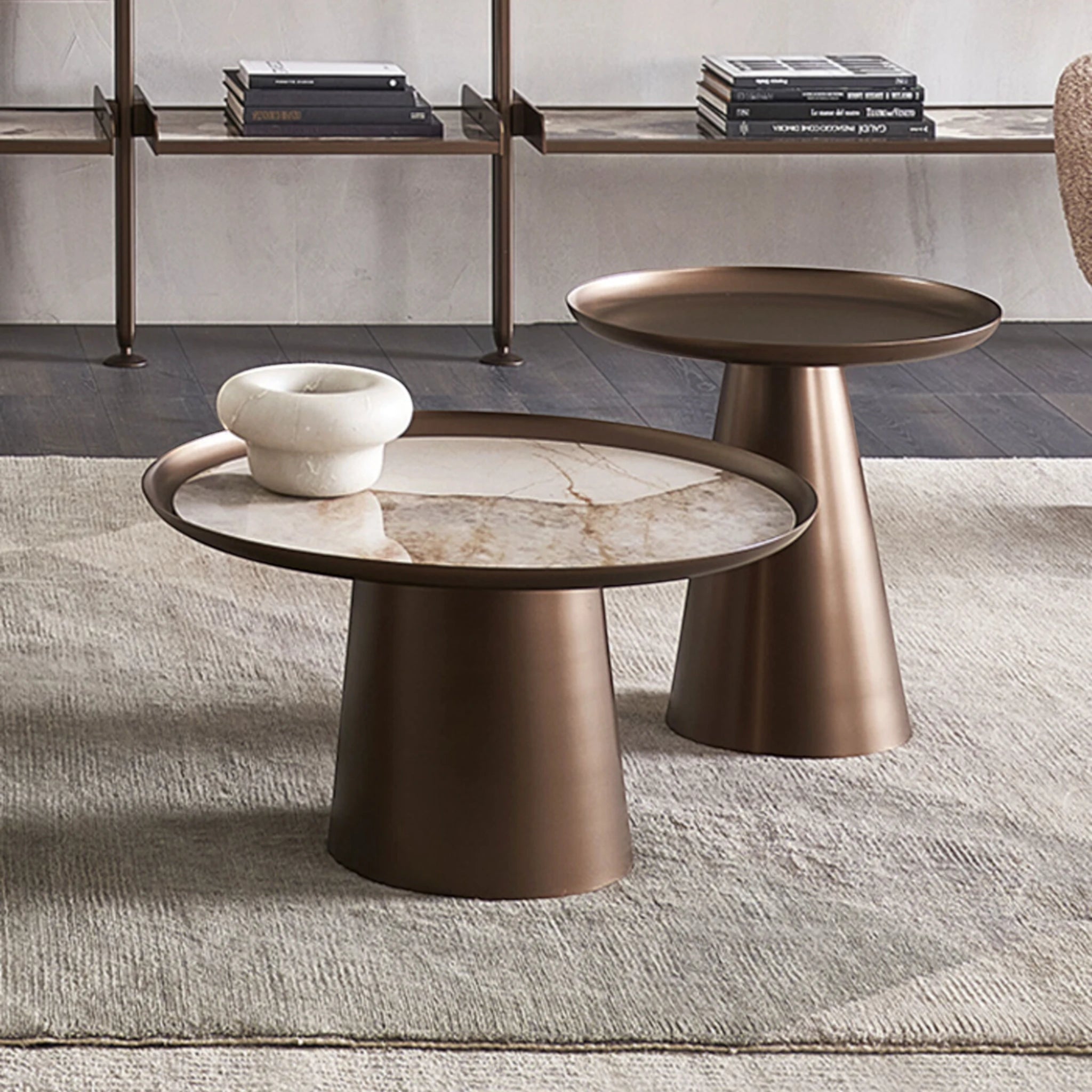 Sculptural and imposing despite its small size, a piece of furniture can become the absolute protagonist of the living area. Fine materials and workmanship, essential design and a decidedly contemporary taste make the Ring coffee tables original, valuable complements, functional elements with a highly characterizing aesthetic. The Ring round coffee table boasts a bronze painted metal structure, the top is in bronze painted metal without ceramic support.