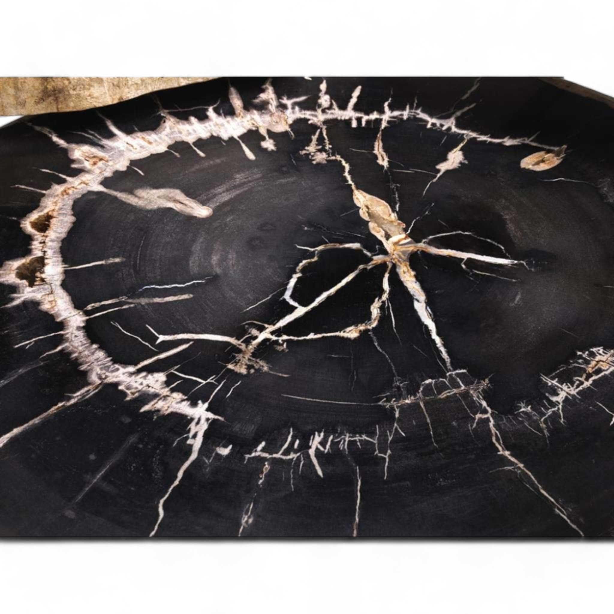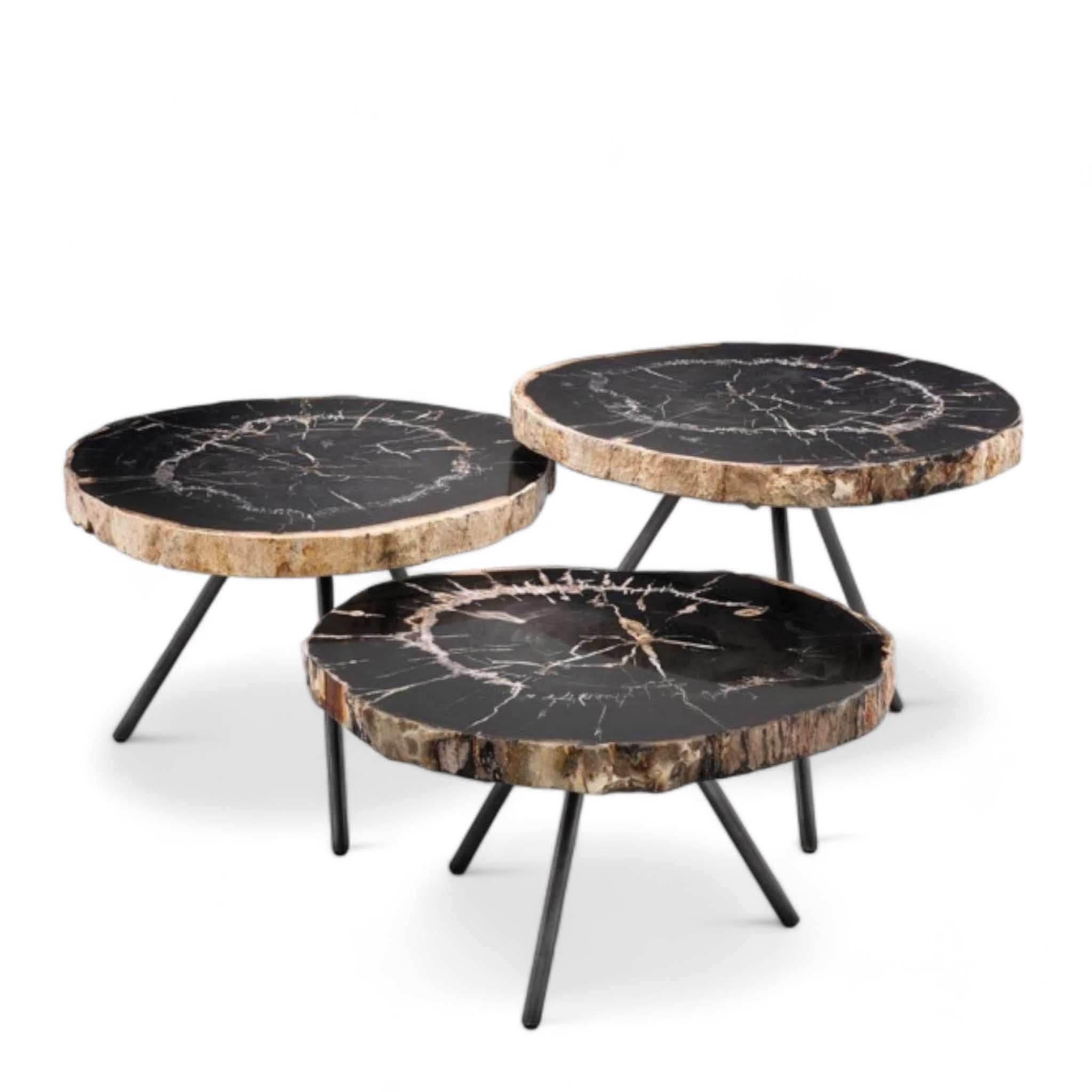 The Soto Coffee Table Set of 3 embodies a fresh vibe mixed with a touch of early 1950s modern. The circular coffee tables are handmade from petrified wood, ensuring each piece is completely unique, with different colors and shapes.
