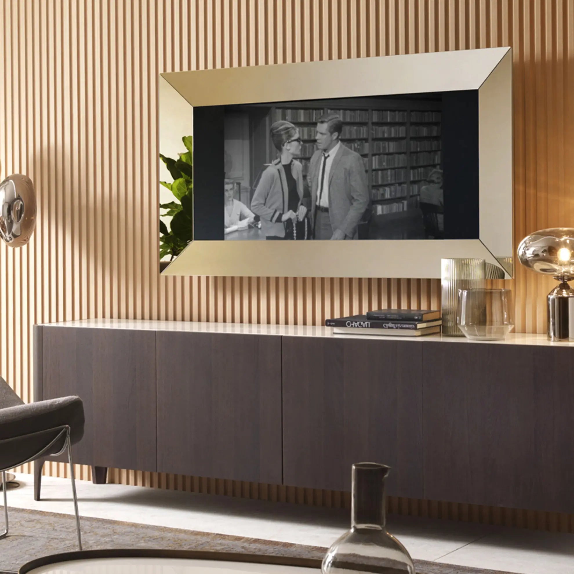 Elegant and essential TV mirror, with a large semi-reflective glass frame that gives it a contemporary taste, Mirror TV hides surprising features: it has a discreet housing for the TV which, when turned off, disappears behind the semi-reflective surface. The structure is suitable only for ultra-flat screens with a maximum thickness of 5 cm in the central part and 7 cm laterally at the locking seat. TV not supplied.