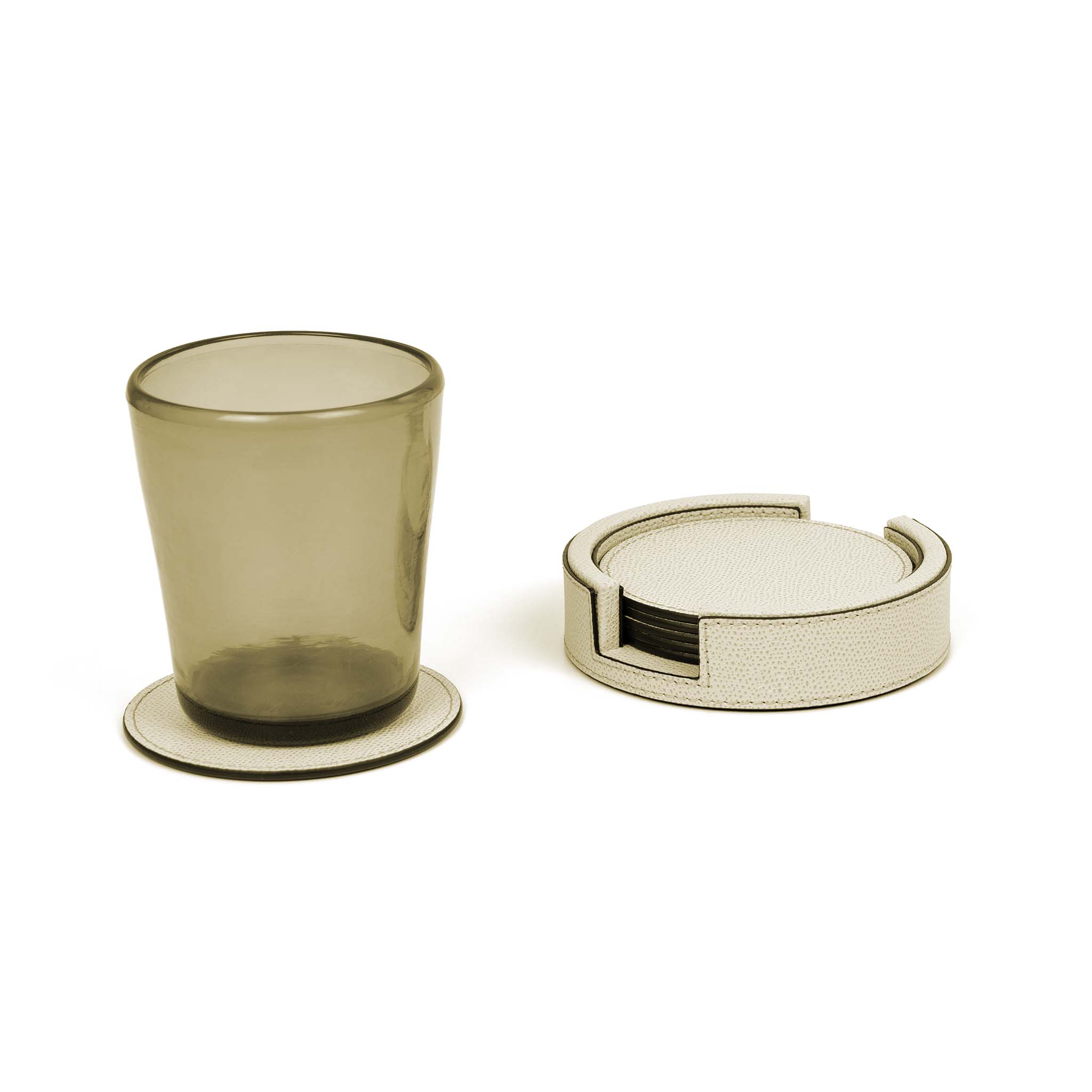 Coaster holder, leather covered wooden base, including 6 coasters 10 x 10.