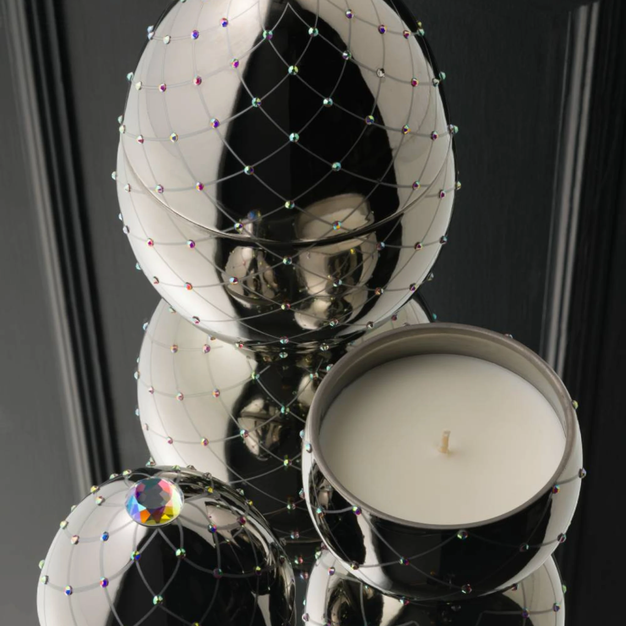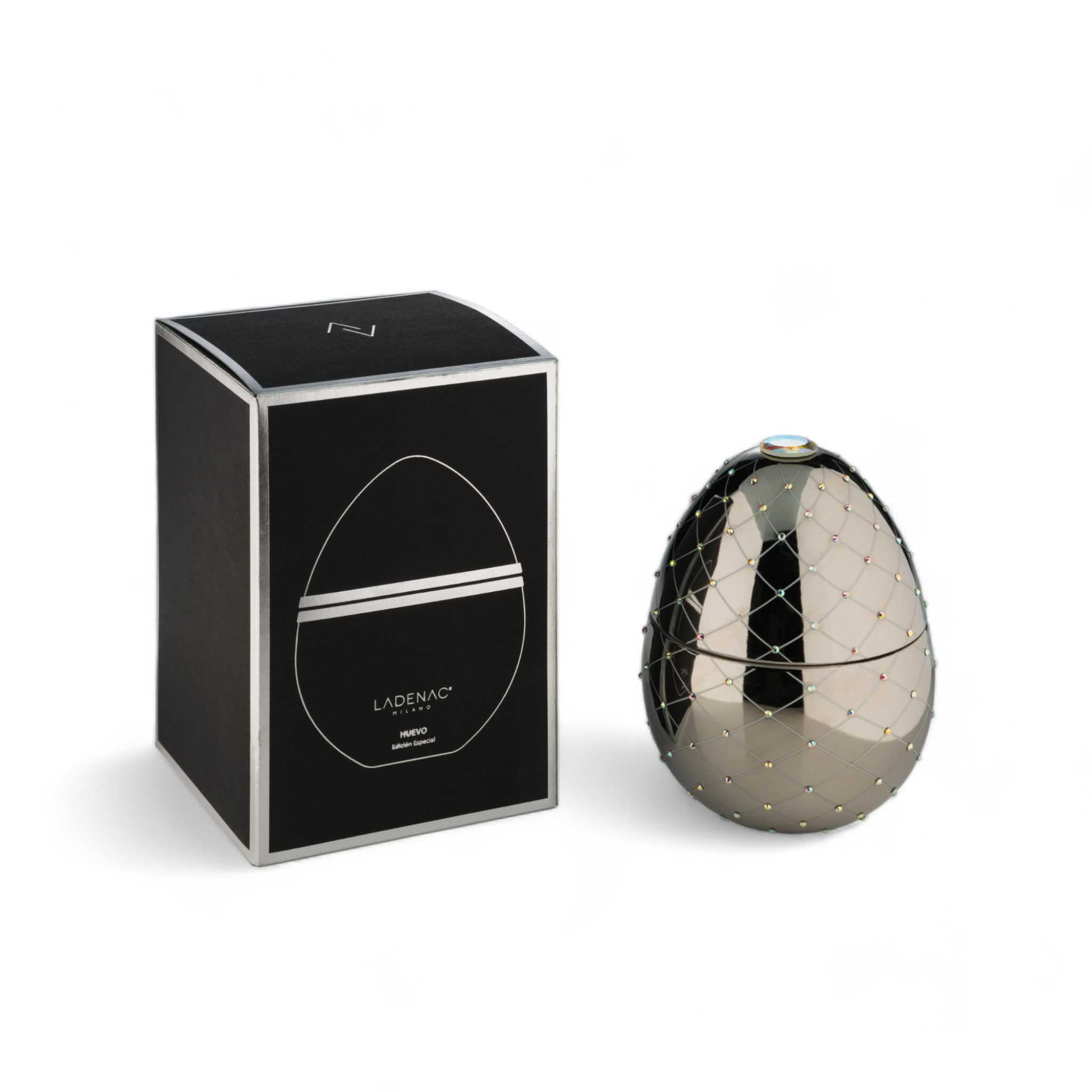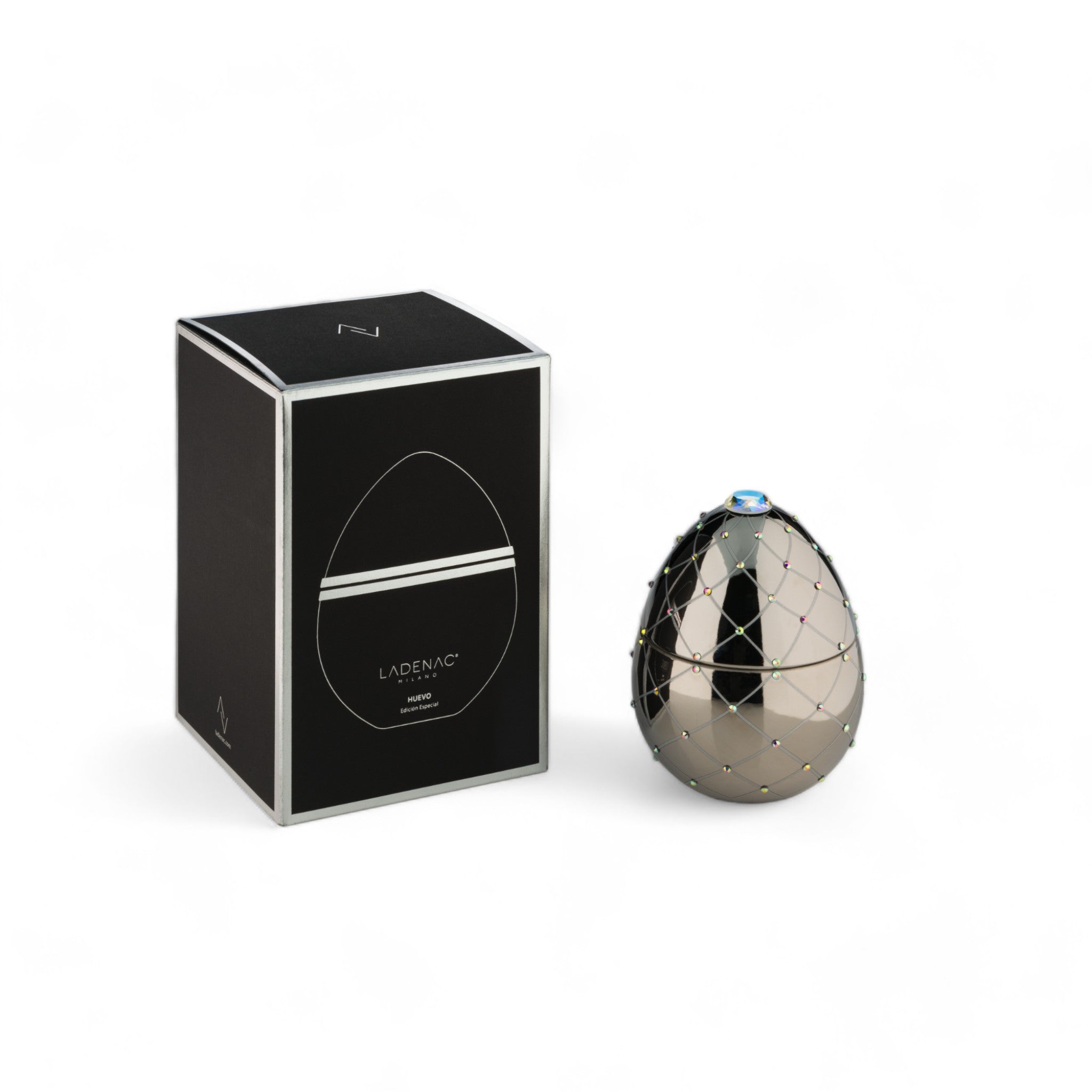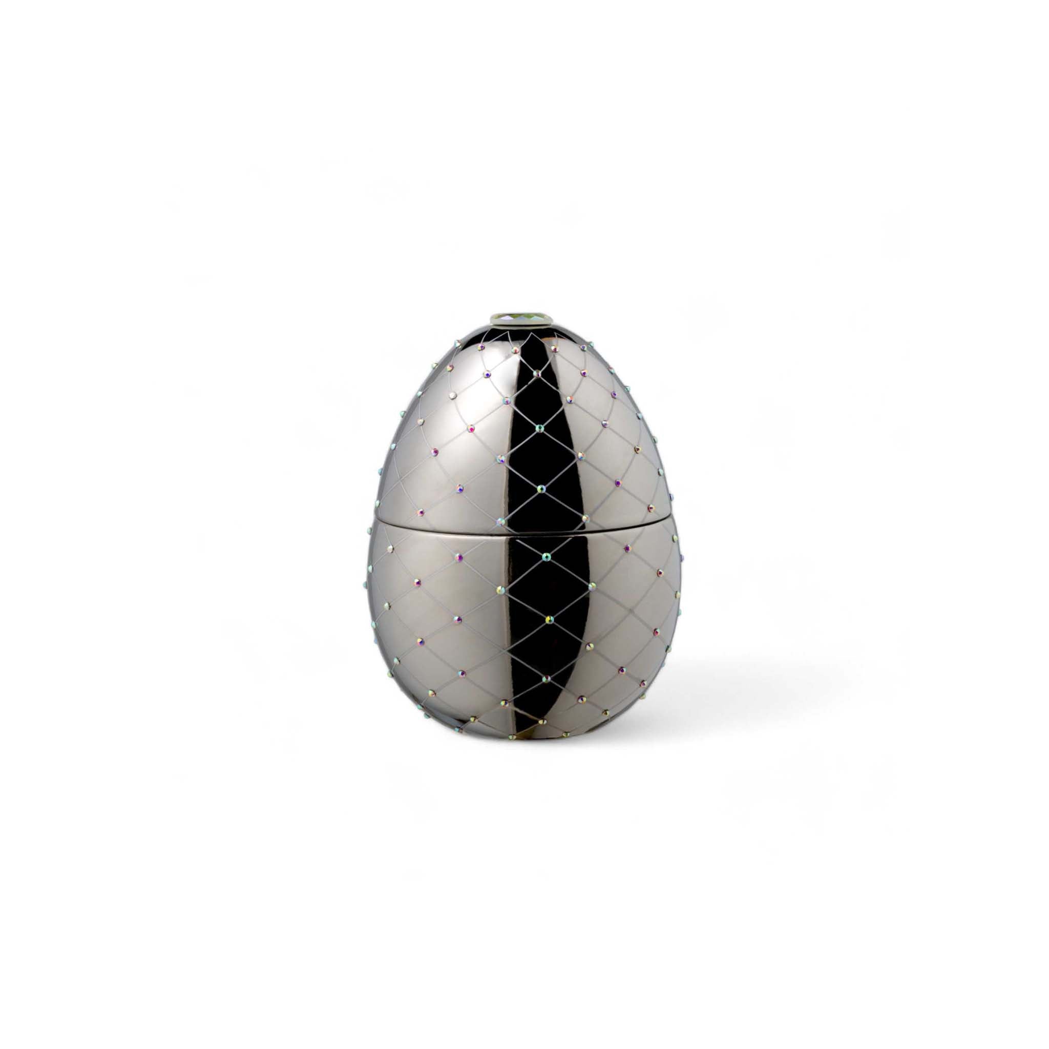 Aromatic candle made of silver-colored egg-shaped ceramic, hot-stamped and decorated with rhinestones. A creation that becomes an elegant and modern decorative element and offers a refined perfume, characterized by notes of sandalwood and nutmeg, with a light touch of petit grain. An exquisite decorative and aromatic piece available in two sizes.