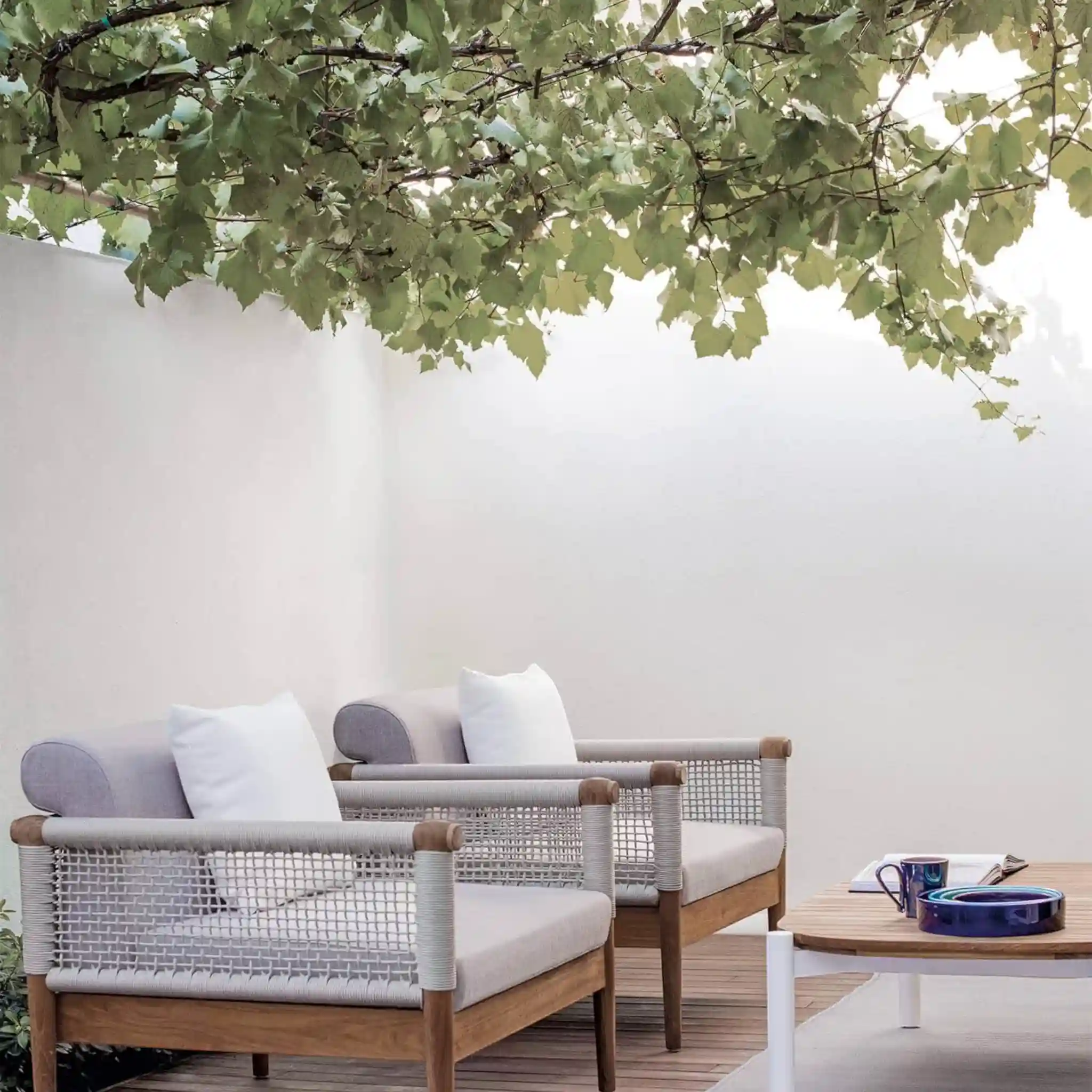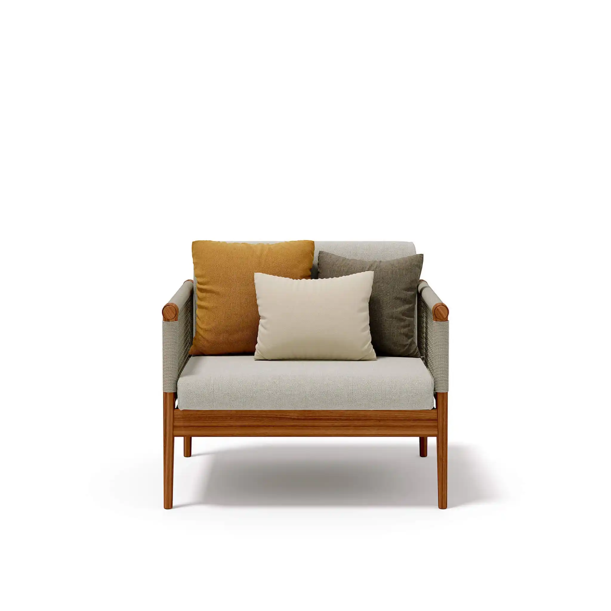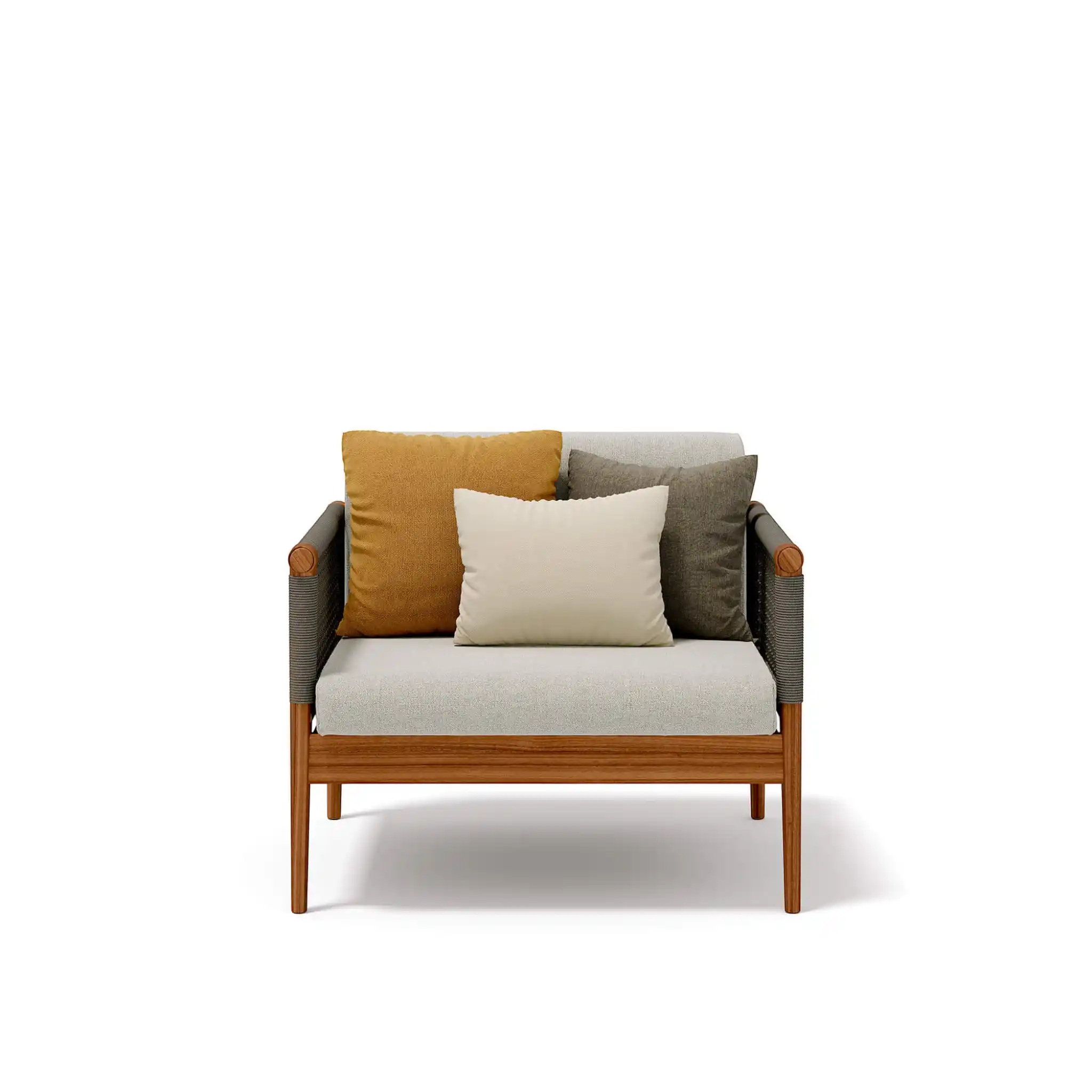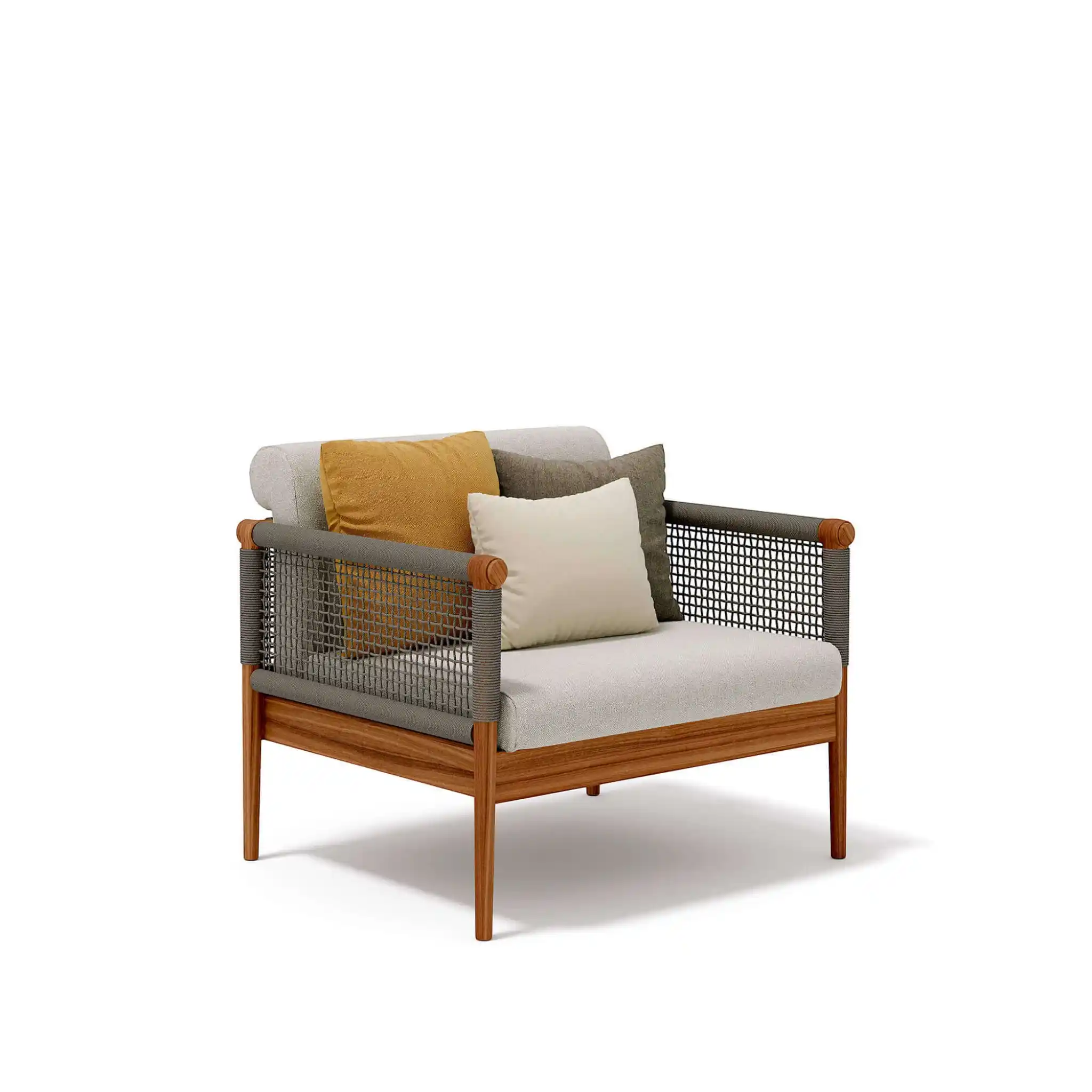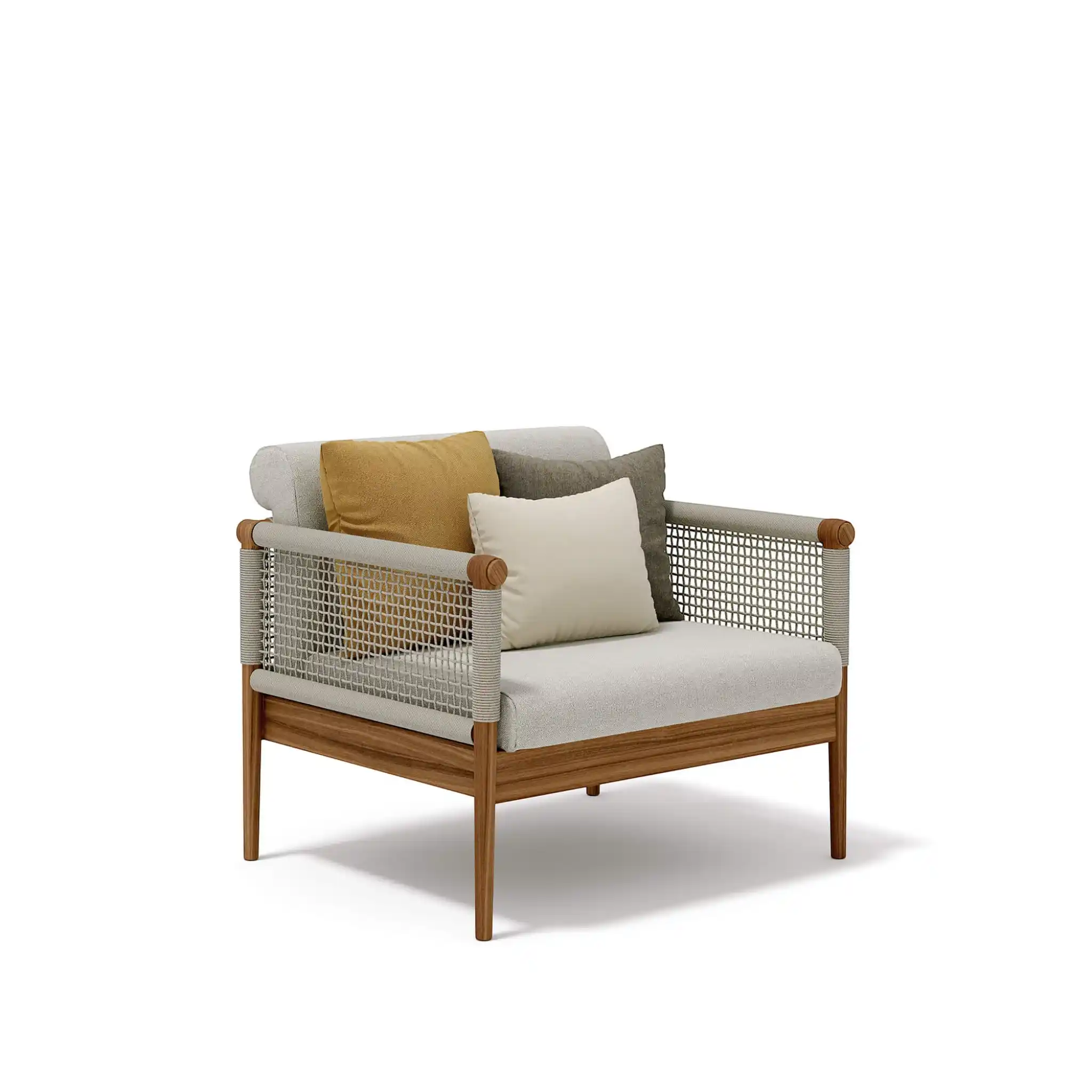 Lodge.25 armchair, clean and minimal design described in a structure completely in teak woven with a round rope that creates a soft and strong mesh. A cozy nest becomes a space for conversation and reading.