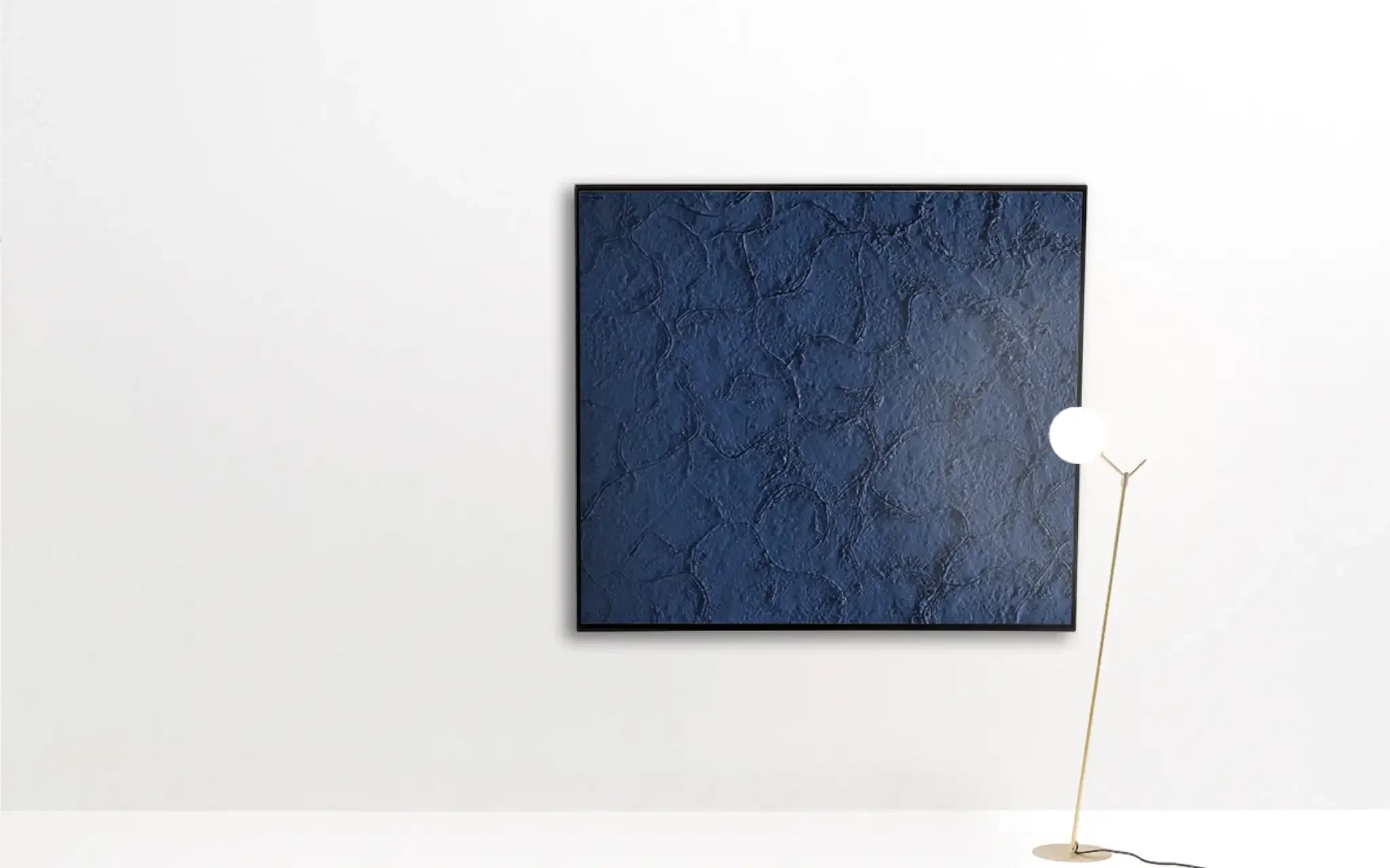 Artistic painting in stucco and resin with bright colors, handmade. Moma frame in golden black finish.