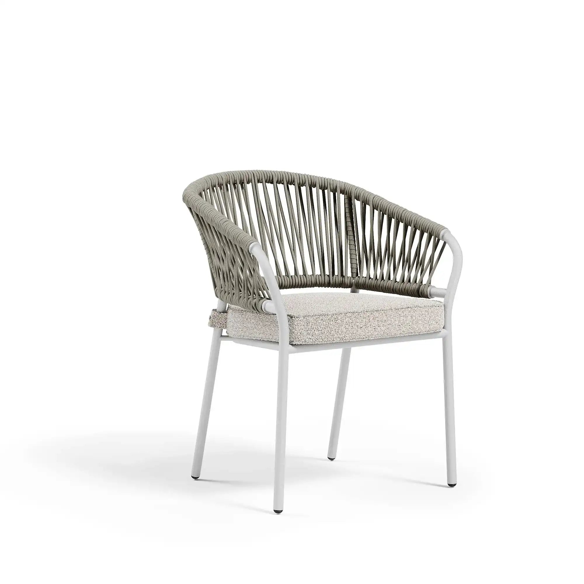 An elegant chair with armrests in white or graphite aluminum, covered with a woven texture of ropes similar to textile fibers. The Pleasure Collection with its natural and soft look gives any place refinement and comfort.