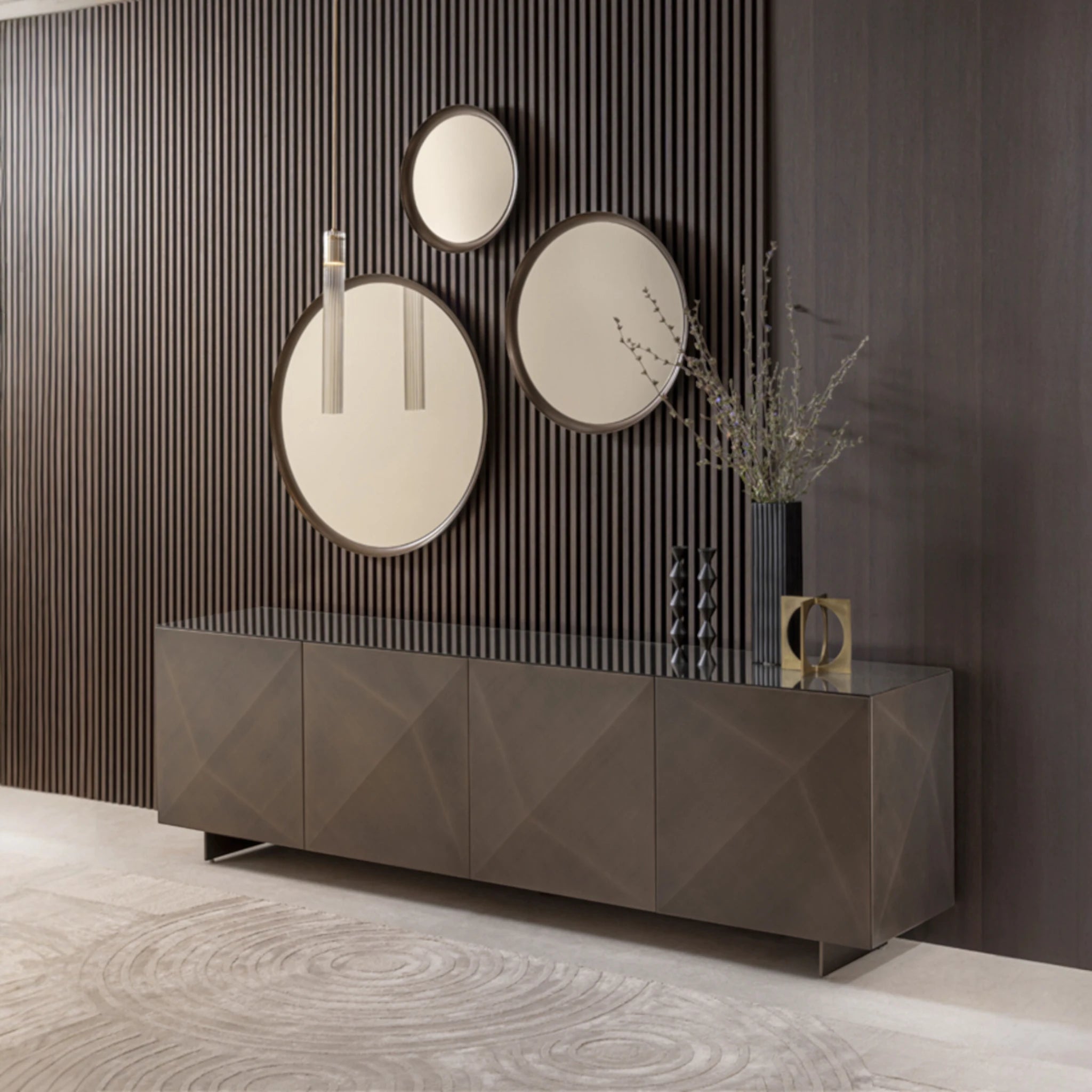 La purezza geometrica del design della madia Cubric esalta il suggestivo gioco di volumi e di linee che emergono grazie ad un sofisticato chiaroscuro che nasce dalla lavorazione dell’acciaio o dalla spazzolatura del colore. La lucidatura manuale crea piccole irregolarità di riflessione sull’acciaio, conferendo unicità ad ogni pezzo. Una speciale lavorazione a diamante, operata su ante e fianchi, aggiunge un ulteriore elemento di raffinatezza.