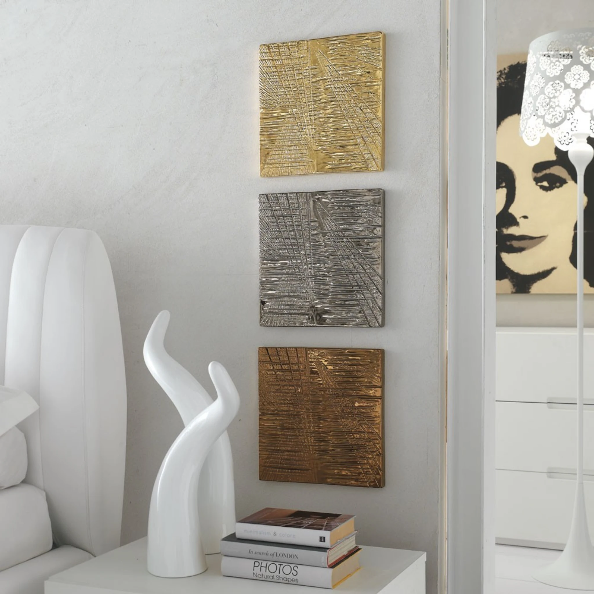 Pannello decorativo in ceramica platino, oro e oro antico.